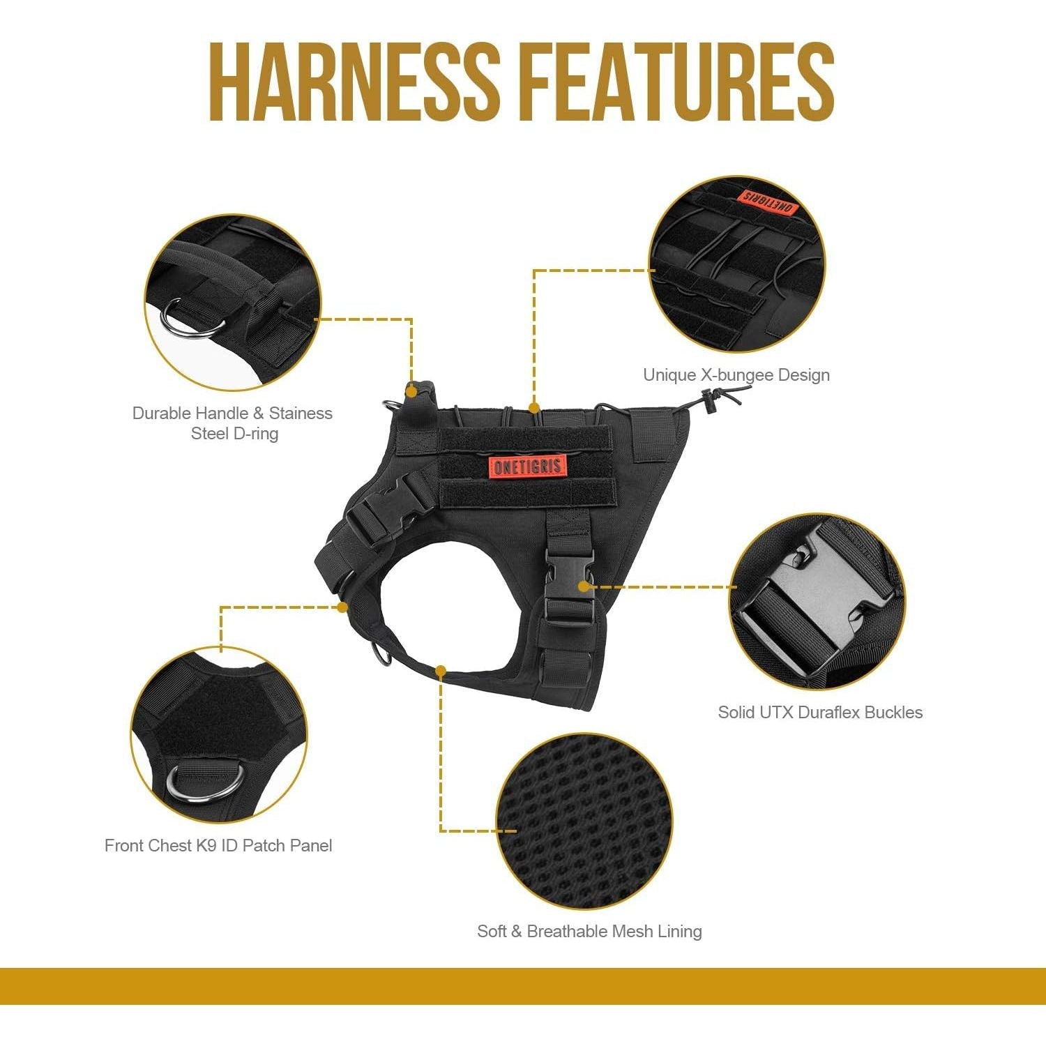 - MOLLE System : Each side features two MOLLE straps as well as hoop & loop strips panel to easily attach molle pouches or ID panels; OneTigris harness is not designed to bear heavy weights and we advise against relying solely on the grab handle to carry your dog