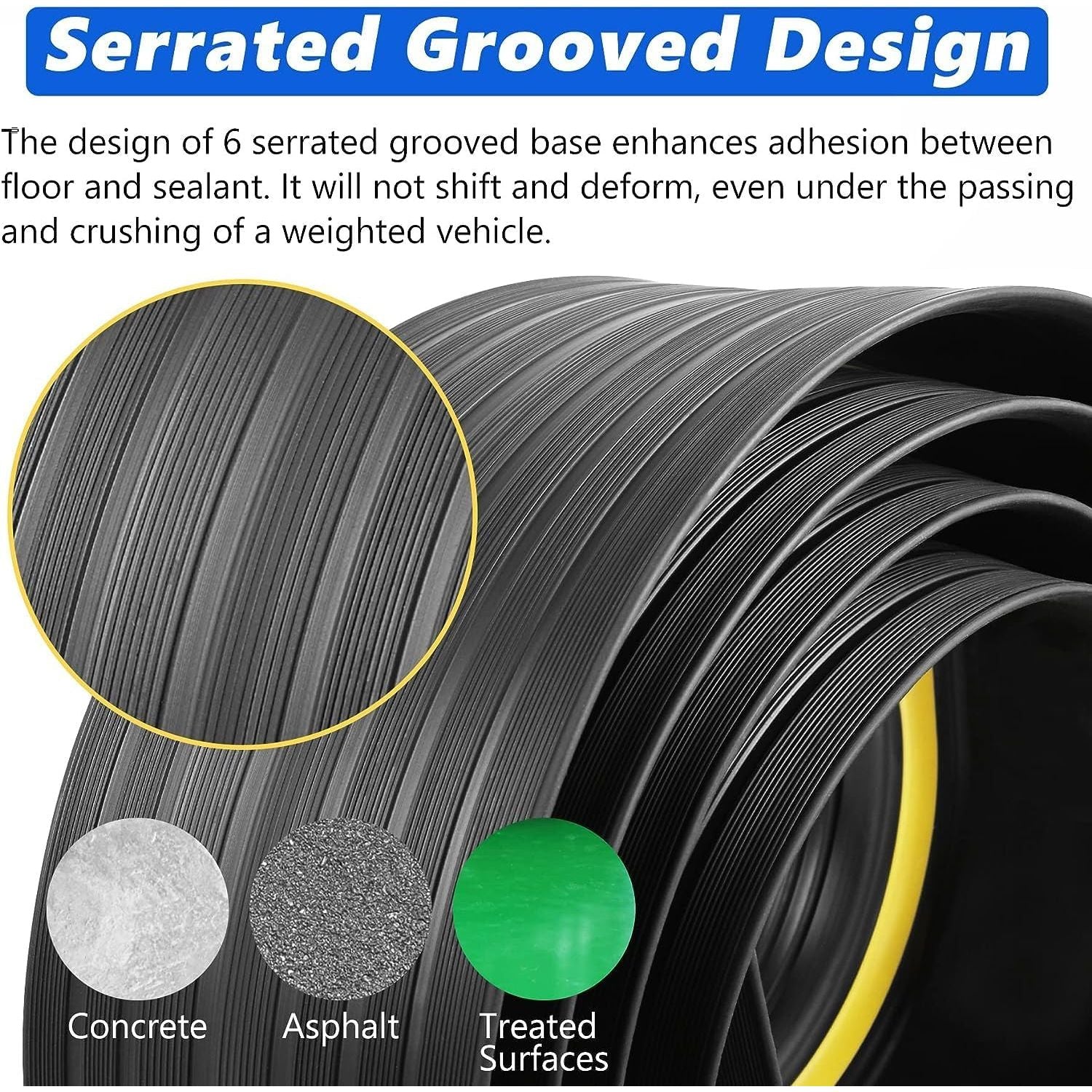 - 【Yellow Tip Design】A yellow tip strip on the garage door threshold strip makes it easier to be discovered by people and cars. The eye-catching yellow strip also enhances visibility at night. Garage threshold seal can prevent slipping and reduce the risk of falling. The design of 6 serrated grooved base enhances adhesion between floor and sealant.