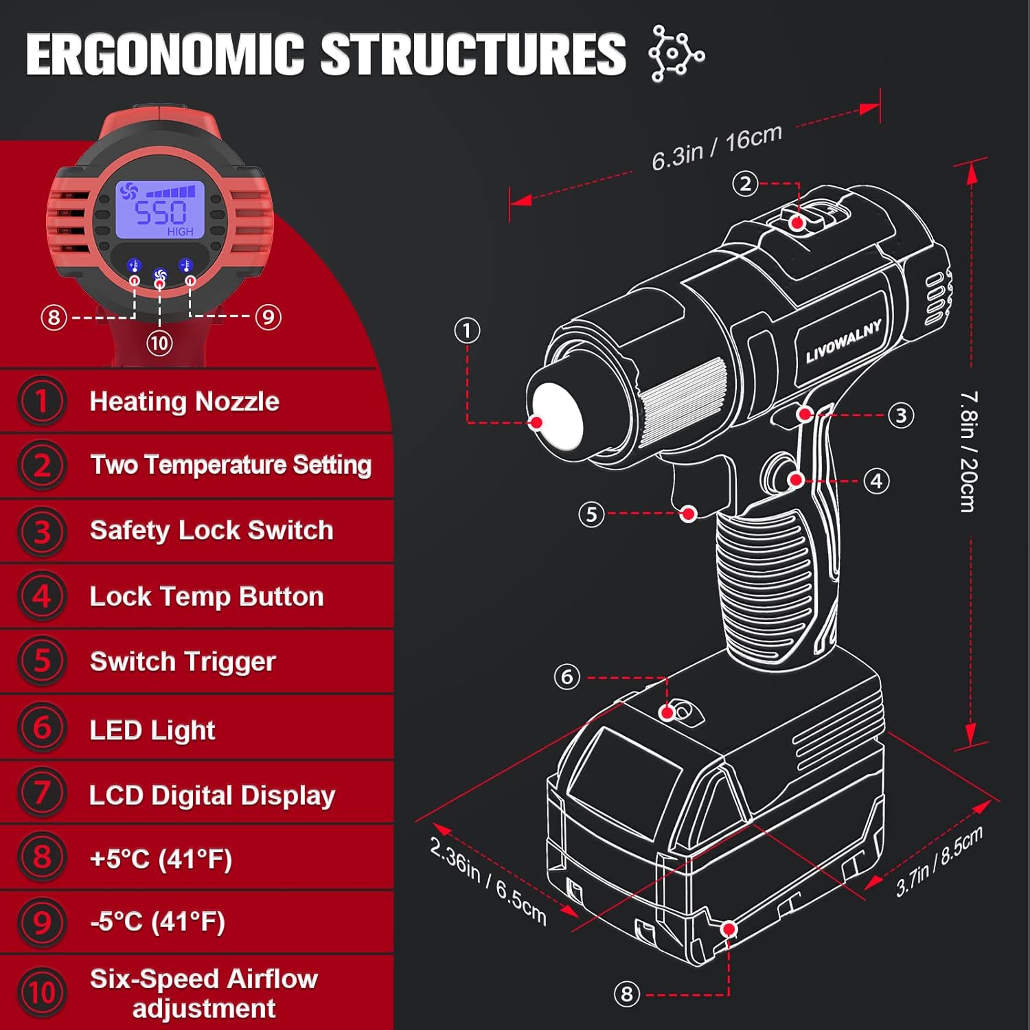 LIVOWALNY Cordless Heat Gun Compatible with Milwaukee 18V Battery, 350W 122?~1202? (50? - 550?) Variable Temperature Control Heat Gun Cordless with LCD Digital Display for Crafts(Battery Not Included) - Just Closeouts Canada Inc.