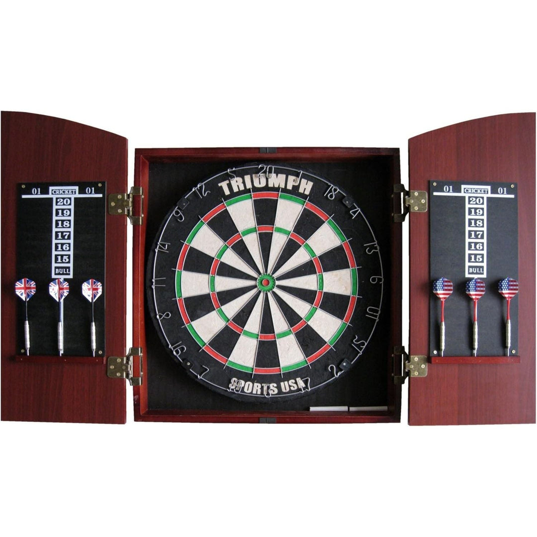 Triumph Wellington Bristle Dartboard with Arch Cabinet 12mm brown PVC laminate wood cabinet. Rotatable number ring for even board wear. Zero glare number ring. Staple free bull's eye. Includes 2 sets of steel tip darts