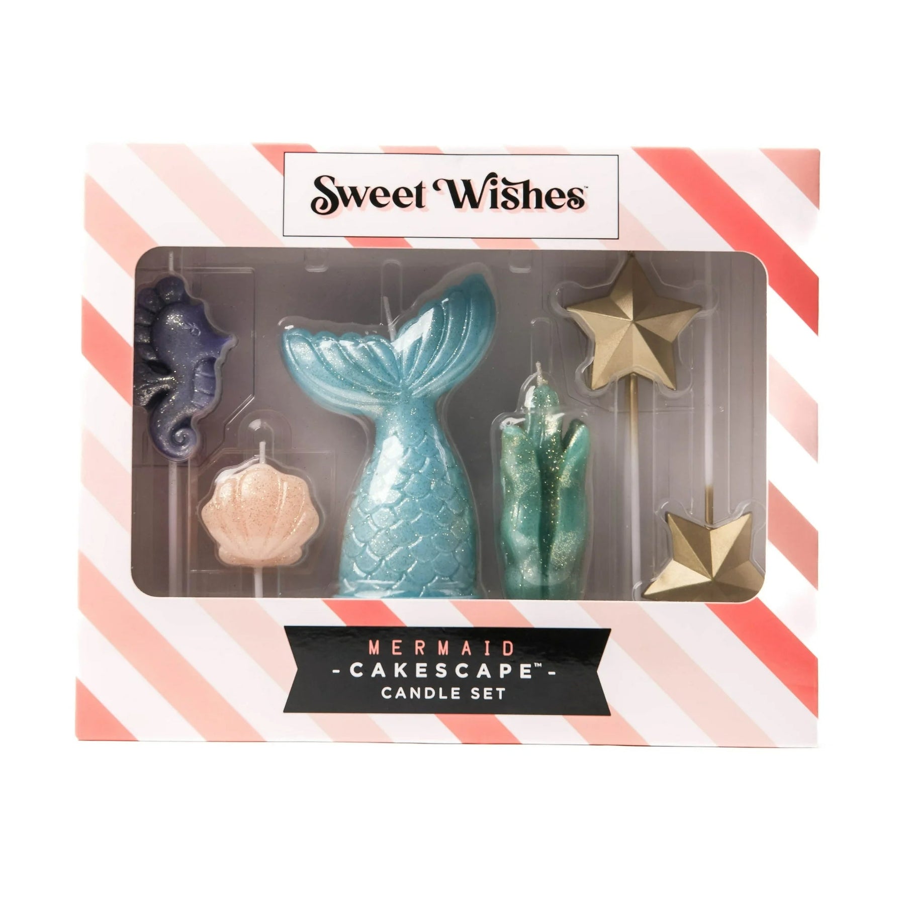 Set includes a beautifully crafted mermaid tail candle, 3 shimmering star candles, 2 shell-shaped candles, 2 seahorse candles, and 1 seaweed-inspired candle for a magical, ocean-themed birthday celebration.