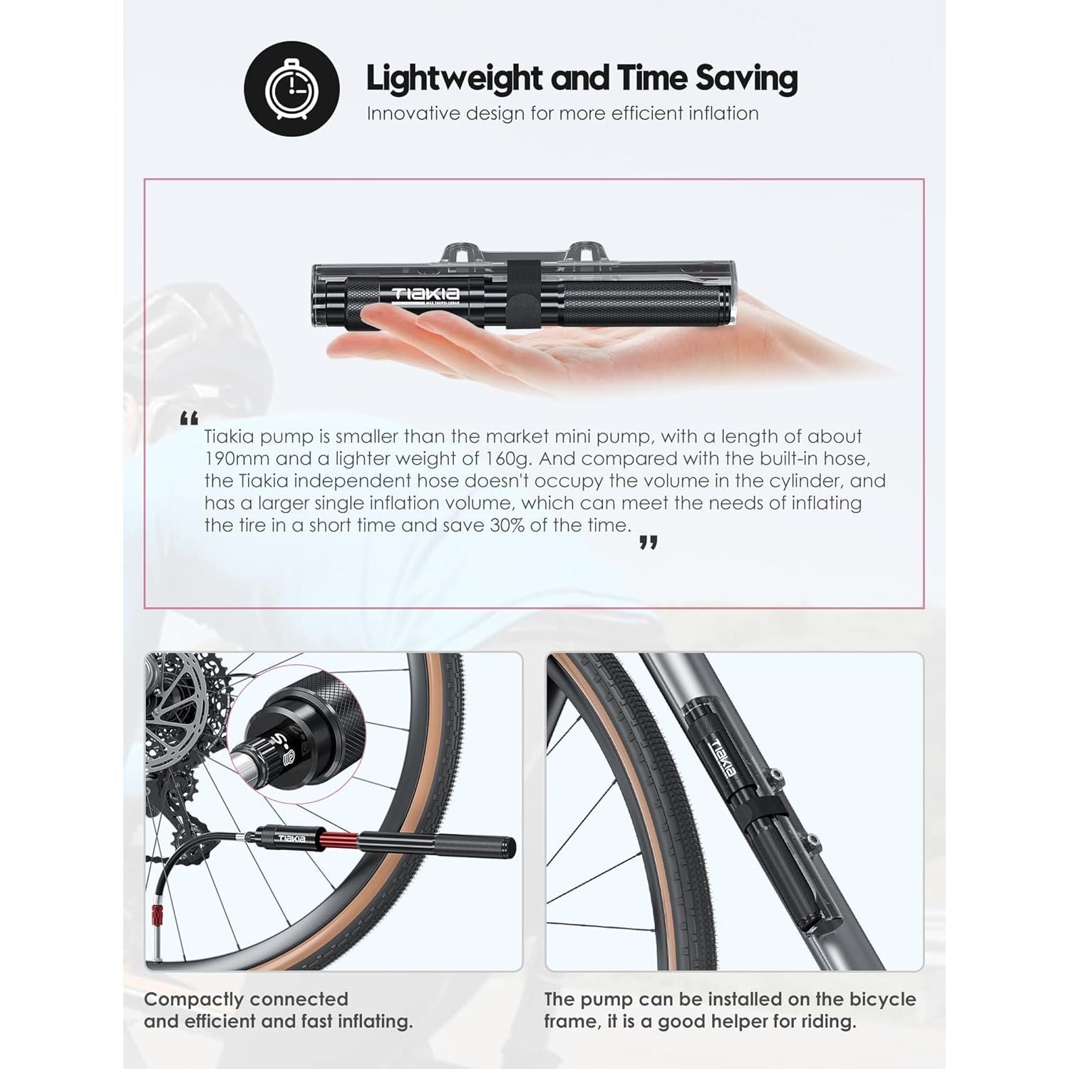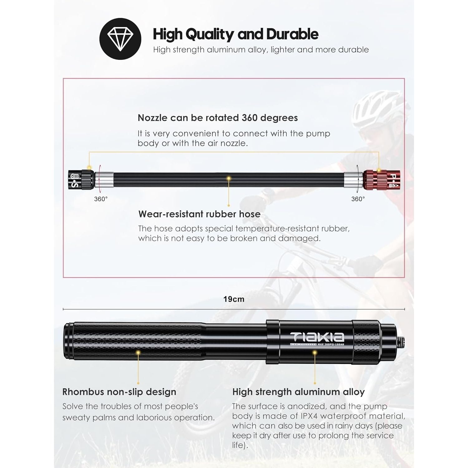 - 【More Time-Saving】: Under the condition of high pressure of 260 PSI, our compact hand pump can also ensure sufficient air volume (about 44 ml per pump) to make your inflation faster, which can save you 50% of your time. The volume of the air intake determines the time required for air pumping. Tiakia separate hose design achieves a balance between air intake volume and high-pressure design, and for the first time realizes a high degree of unification that saves time and effort for air pumping.