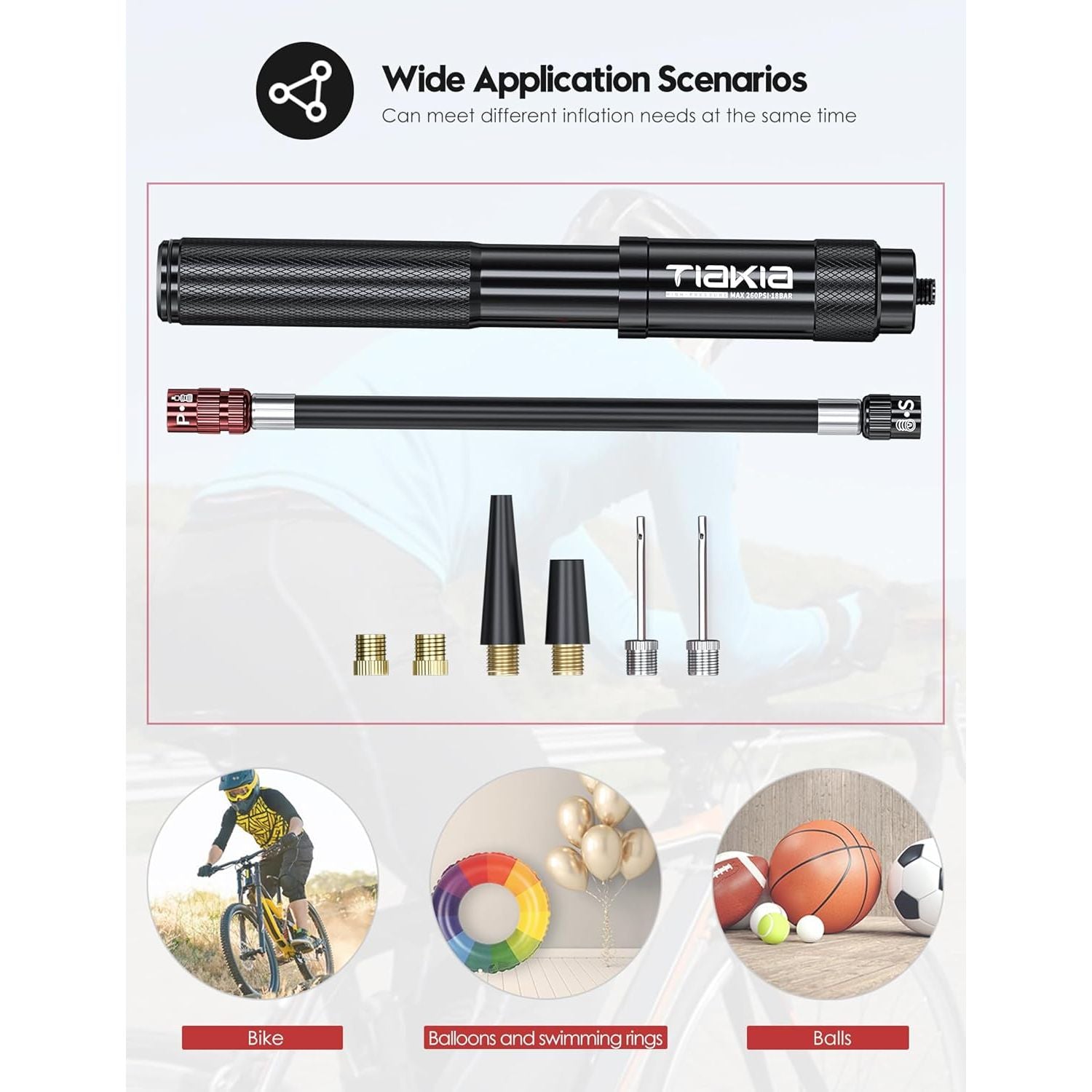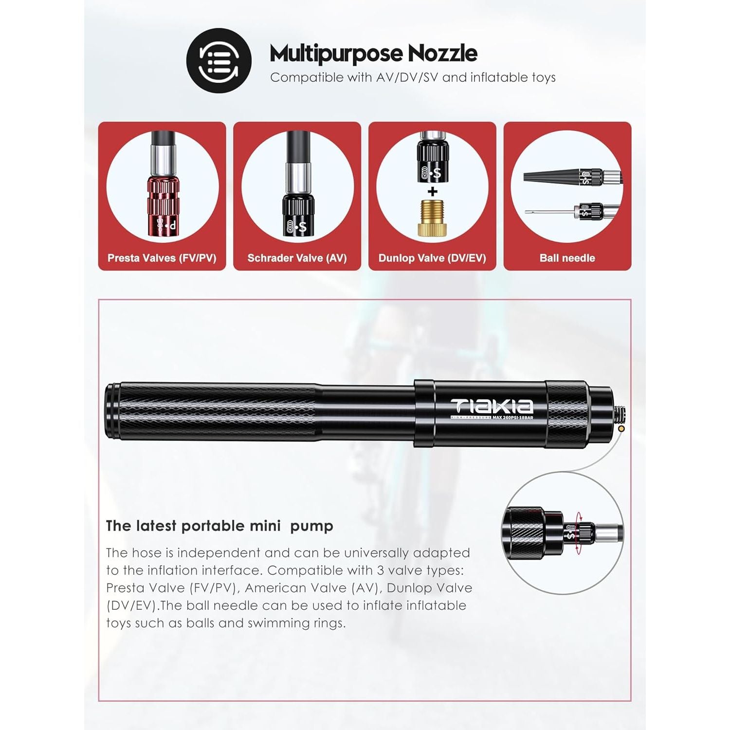 - 【More Valve Types】: This mini high-pressure pump is suitable for schrader, presta and donlop valve. schrader & presta double-head valve design is easy to use. Tiakia mini tire pump can inflate bicycles, electric cars, motorcycles, automobiles, sports balls and swimming rings (with a conversion donlop valve attached), and are versatile.