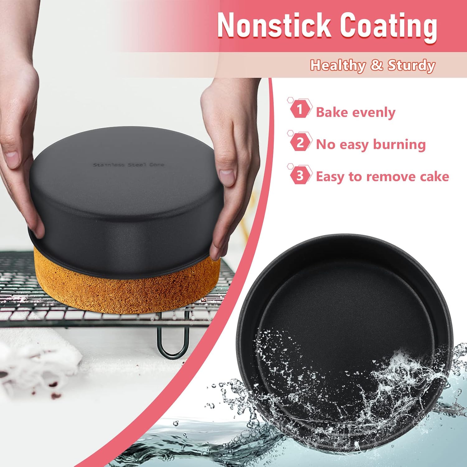 - NON-TOXIC NONSTICK COATING - The coating with healthy non-stick coating makes it a breeze to release Also easy for making a perfect cake without burning. The seamless and round corner design makes food not easy and super easy to clean, hand wash recommended for long serving
