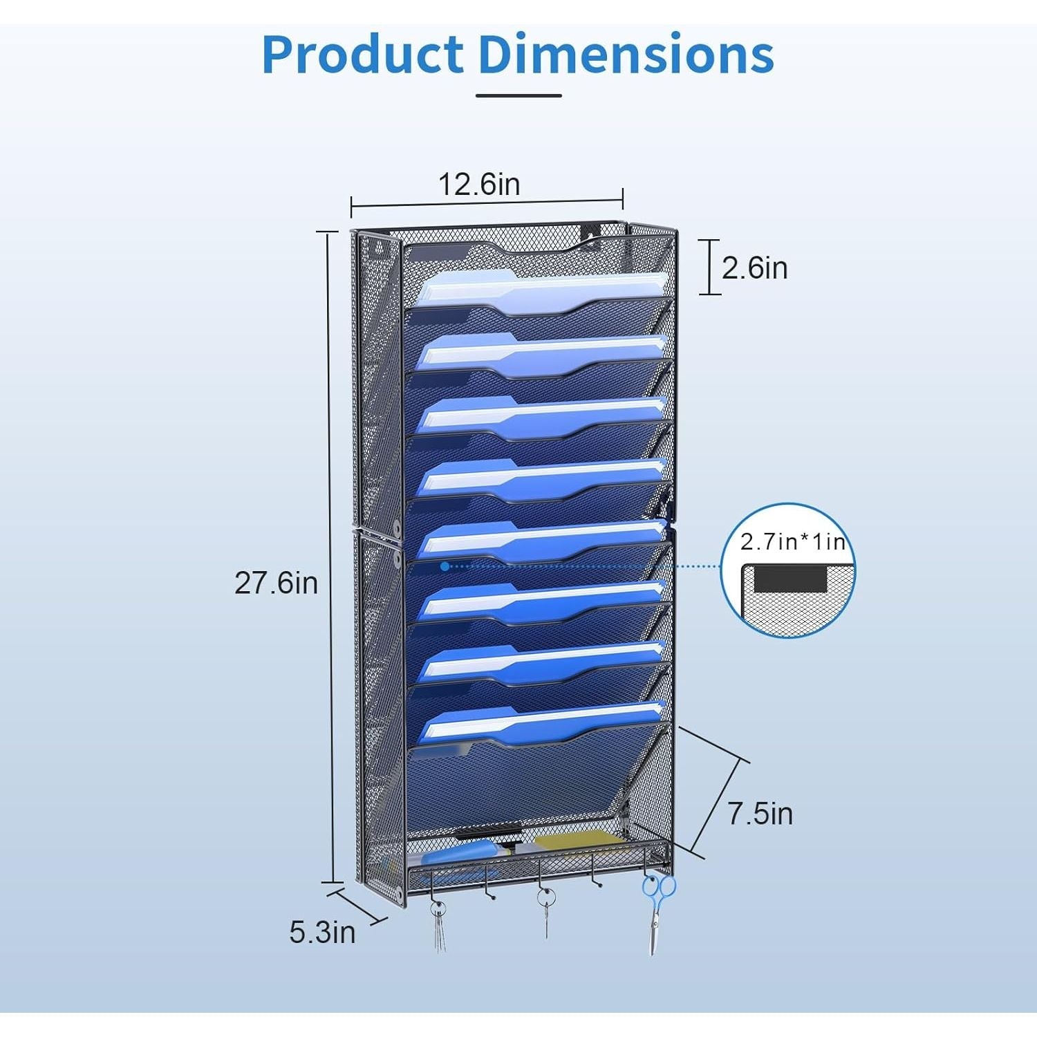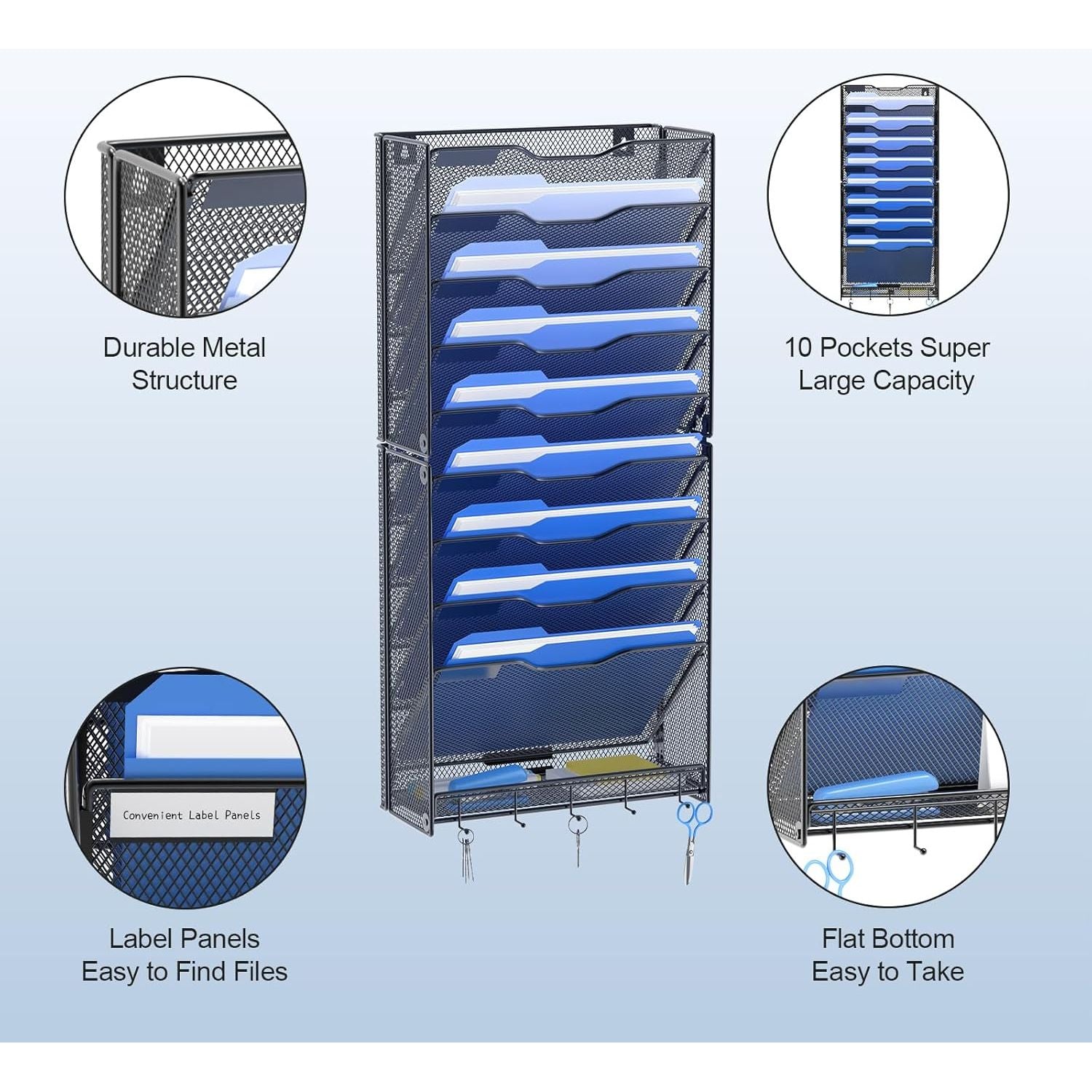 - [EASY TO CLEAN]: Our wall folder holder adopts a mesh hollow design, which is easy to clean and not easy to accumulate dust. 10-tier wall file organizer, large capacity for office organization.