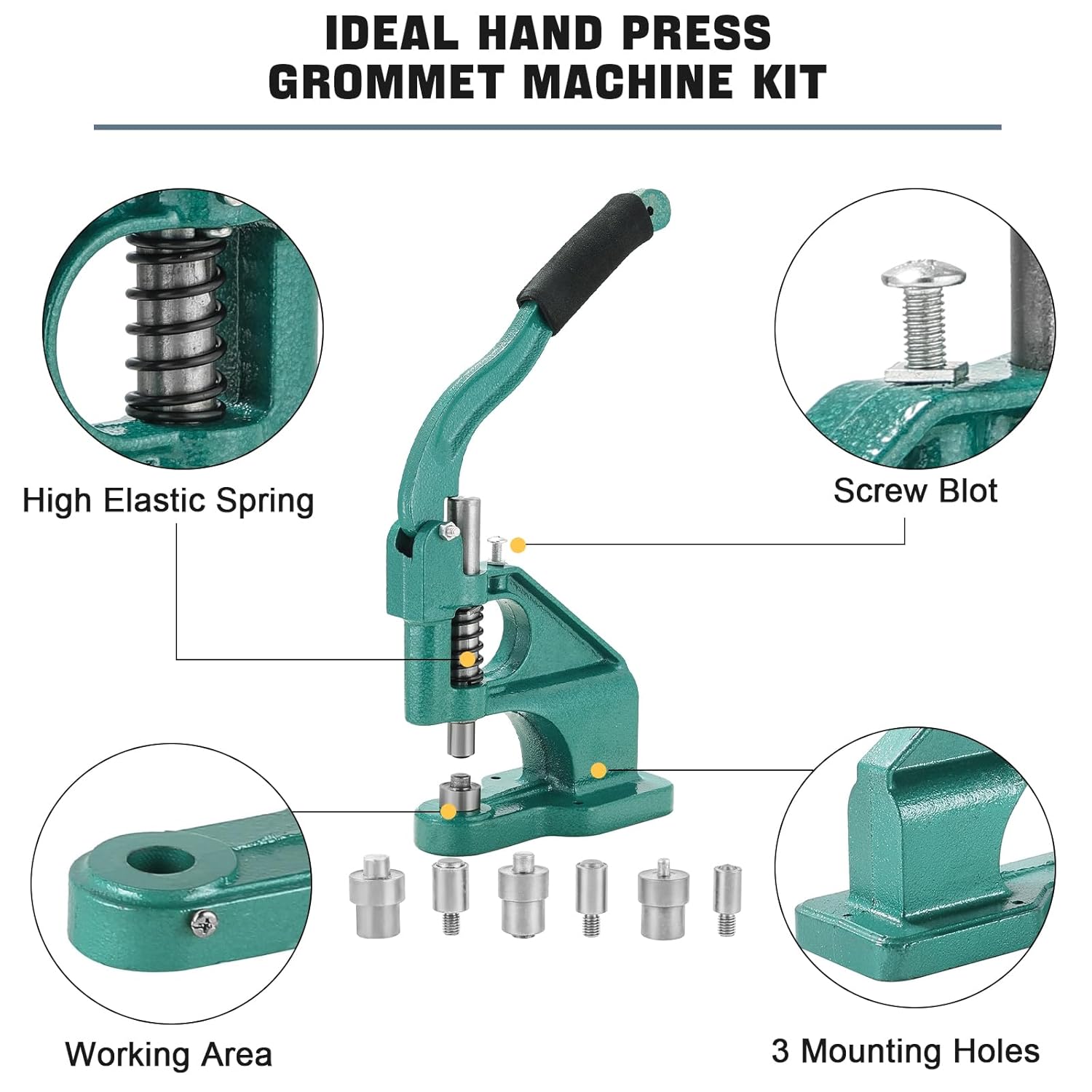 • Ideal Hand Press Grommet Machine Kit: This 3 die hand press grommet machine is an essential equipment for dress makers, arts & crafts, sign shops and manufacturers, ideal for craft and industrial use; The rivet grommet machine includes a grommet machine with mobile base, 3 dies & 1500 grommets, manual operation, easy to use the grommet machine