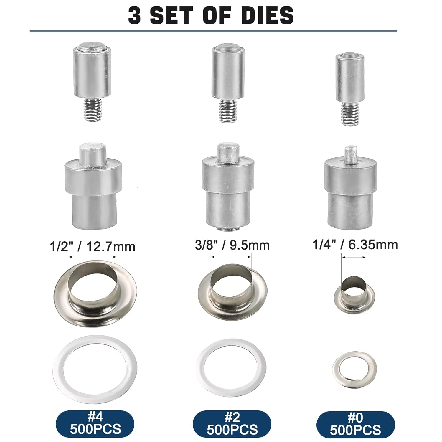• 3 Interchangeable Dies & Grommets: This grommet machine includes #0 (1/4", 6 mm), #2 (3/8", 9.5 mm), #4 (1/2", 12 mm) dies & 1500 pcs grommets (500 pcs each size) for meeting different needs