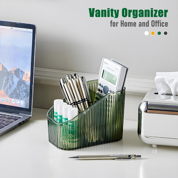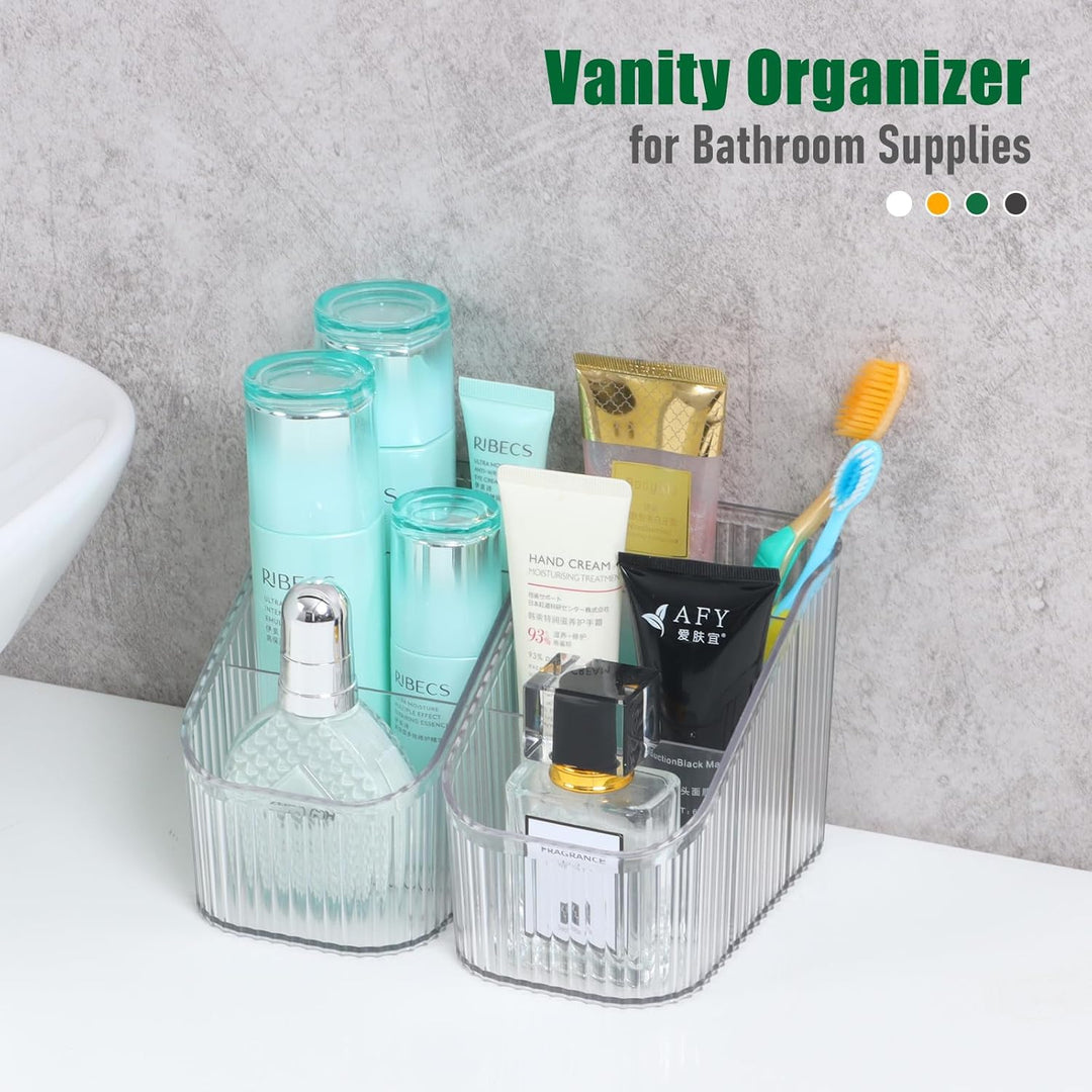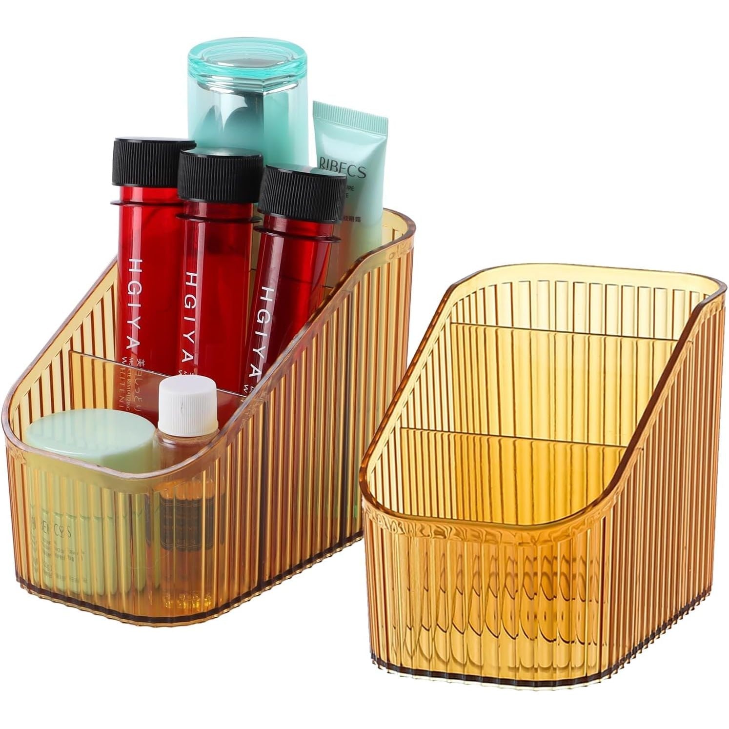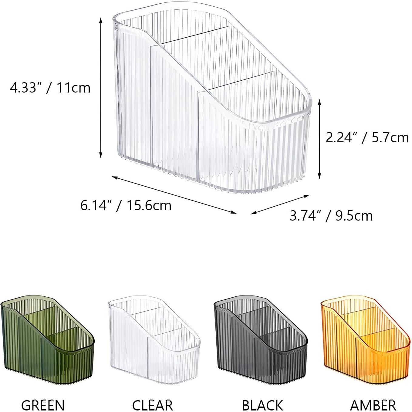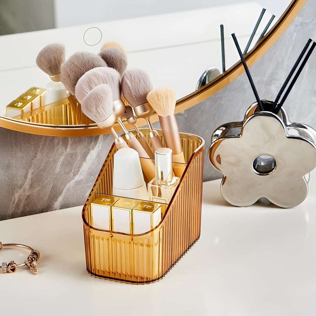 - Amber Makeup Organizer: This colorful & transparent storage box from OSteed is ideal makeup brush holder organizer and bathroom countertop organizer. As vanity organizer, it could store cosmetics stuff like makeup brush, lipsticks, skincares, toiletry and sunglasses.