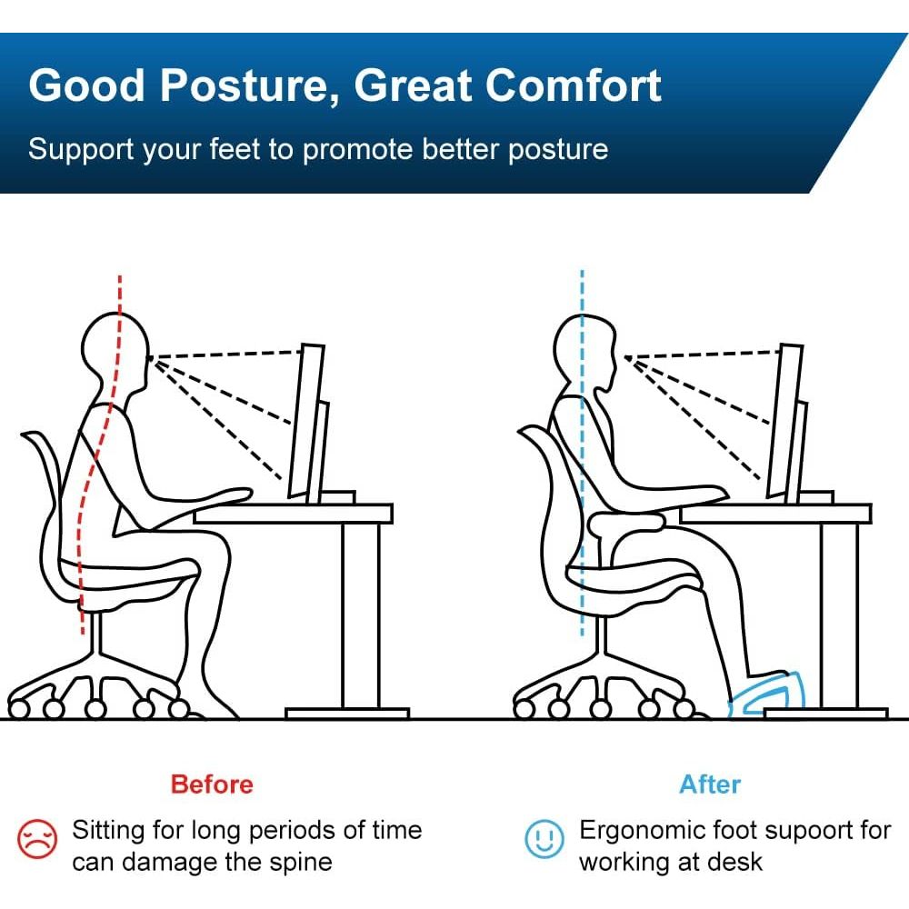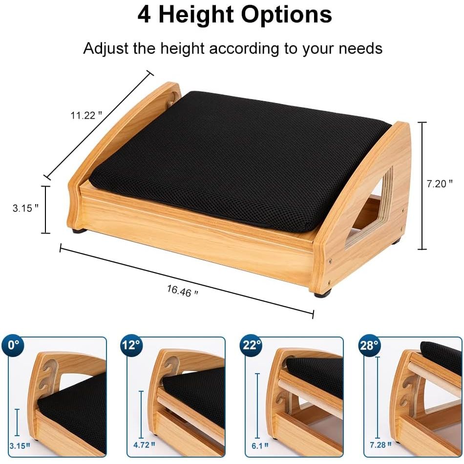 - Ergonomic Four Adjustable Angles: Experience optimal support when sitting or standing at the office with this ergonomic under desk footrest featuring four adjustable heights. The desk foot rest caters to your needs, helping to alleviate shoulder, back, and leg pain, reduce pressure on the spine and legs, improve sitting posture, and promote leg blood circulation.