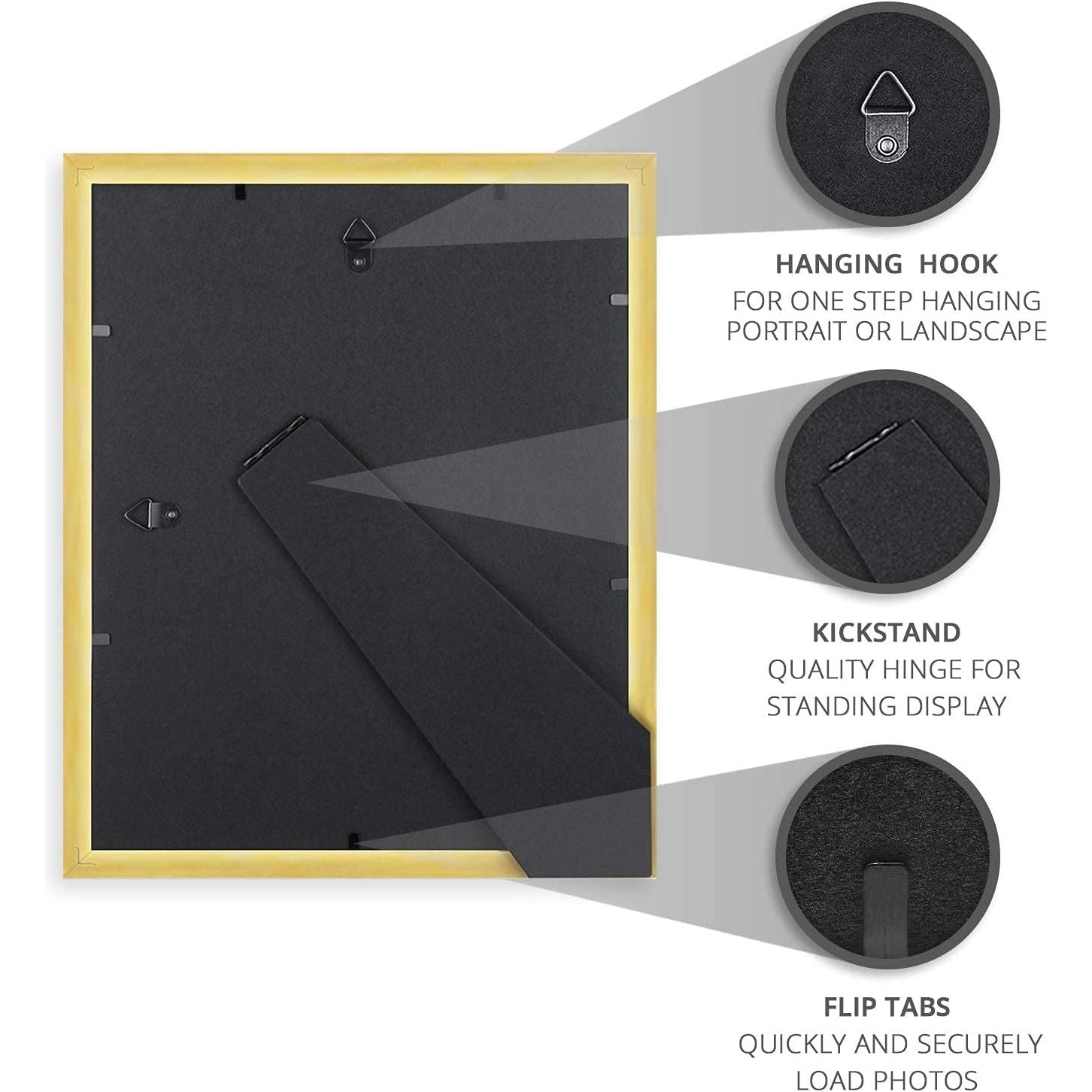 - INCLUDES - 6 Gold frames that fit standard 8" x 10" pictures or prints with an opening that reveals a 7.5 x 9.5 inch image; Plus, high-definition glass for clarity and image protection; D-ring hooks and a built-in easel kickstand