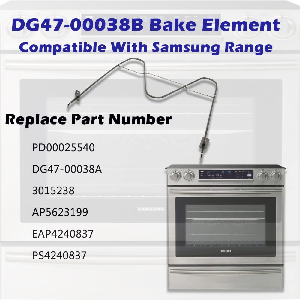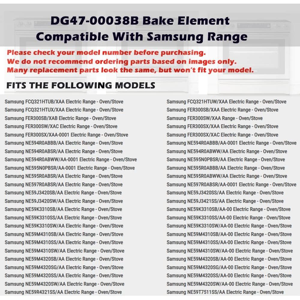 - 【Compatibility】DG47-00038B compatible with Samsung range/stove/oven Bake Element that is located at the bottom of the oven. Please check your model number before purchasing. We do not recommend ordering parts based on images only. Compatible models are but not limited to FCQ321HTUB/XAA-00, FCQ321HTUW/XAA-00, FER300SX/XAA-00, FER300SX/XAA-01, NE595R0ABSR/AA-00, FER300SB/XAA-00, FER300SW/XAA-00, NE595R0ABBB/AA-00, NE595R0ABBB/AA-01, NE595R0ABWW/AA-00, NE595R0ABWW/AA-01, NE59M4310SS/AA-00, NE59M4320SW/AA-00, NE597R0ABSR/AA-02, NE59J3420SS/AA-00, NE594R0ABBB/AA-01, NE59J3420SS/AA-01, NE59J3420SS/AA-02, NE59J3420SS/AA-03, NE59J3420SS/AA-04, NE59J3420SS/AA-05, NE59J3420SS/AA-06, and more!