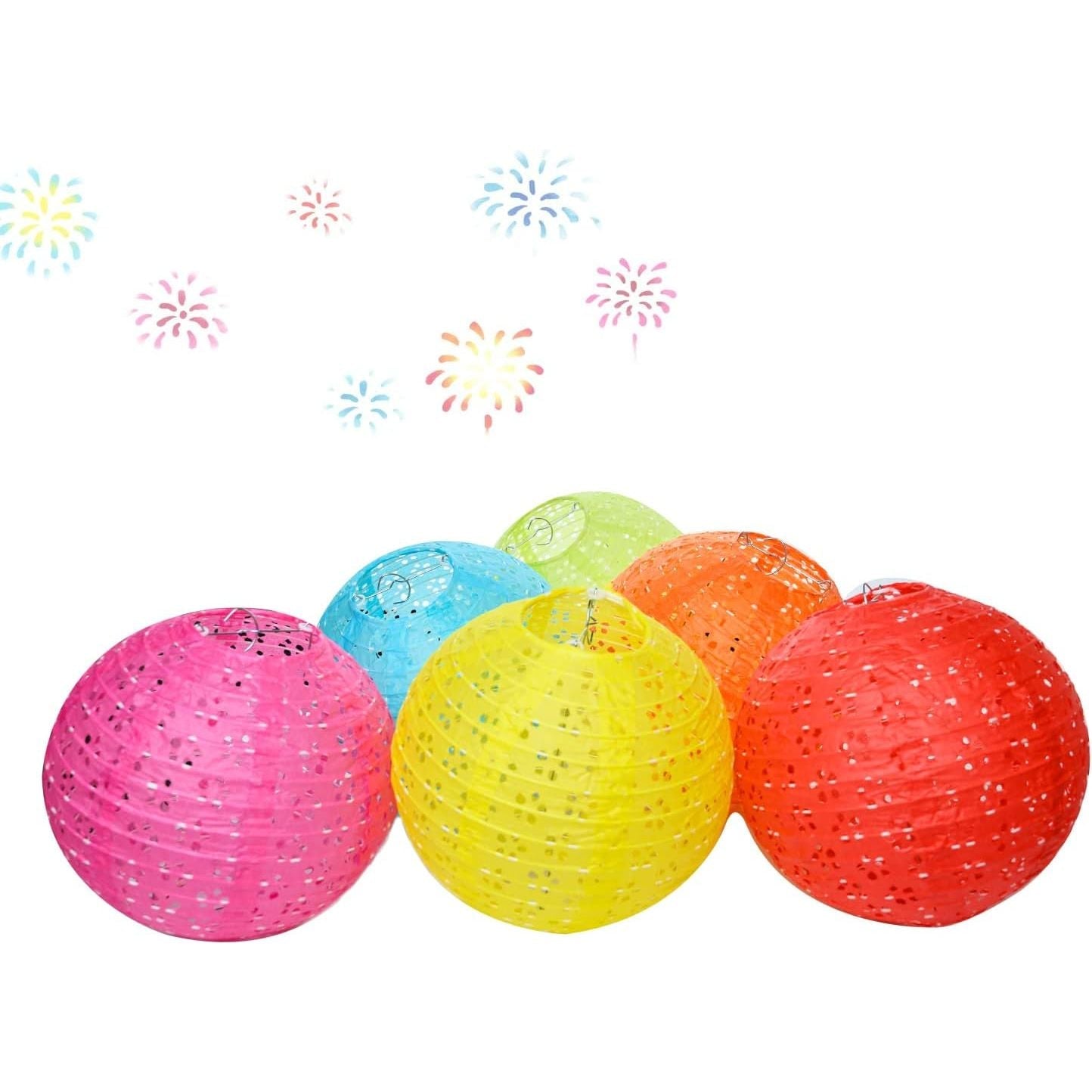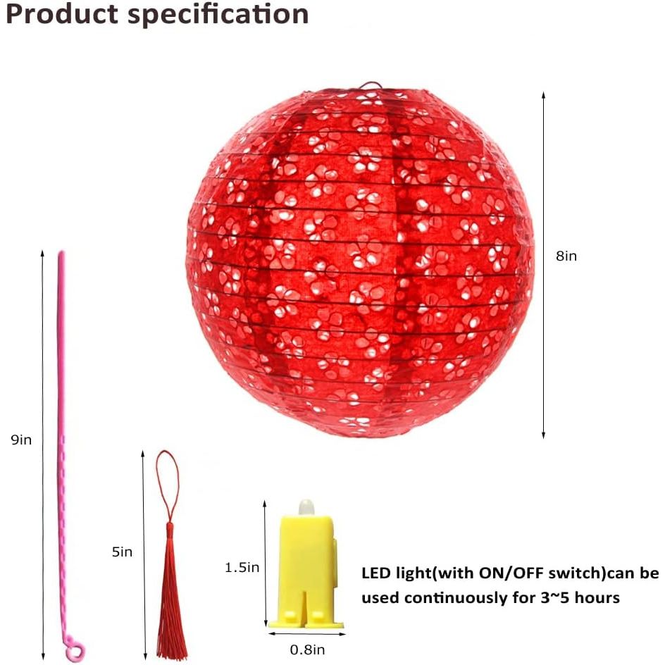 • 【WHAT YOU WILL GET】12pcs 20cm hollow out round paper lanterns (2 x Red, 2 x Blue, 2 x Green, 2 x Rose Red, 2 x Orange, 2 x Yellow, total 6 colors), 12 disposable warm white LED lights, 12 red tassels, 12 plastic lantern sticks. You can hang tassels, sticks and LED lights on the lanterns to easily create a Chinese or Japanese style festive atmosphere.