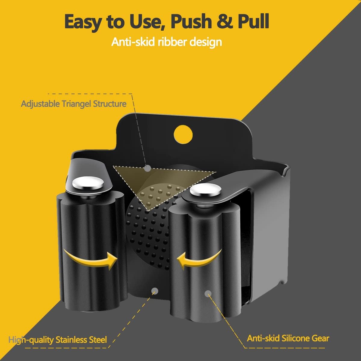 - EASY TO USE: You can slide the broom in and out with one hand. Unlike plastic holders with spring-loaded rollers, this broom organizer wall mount has rubber rollers to hold the handles, allowing the handle to slide in from the front and be held firmly in place. You don't have to worry about hurting your hand.