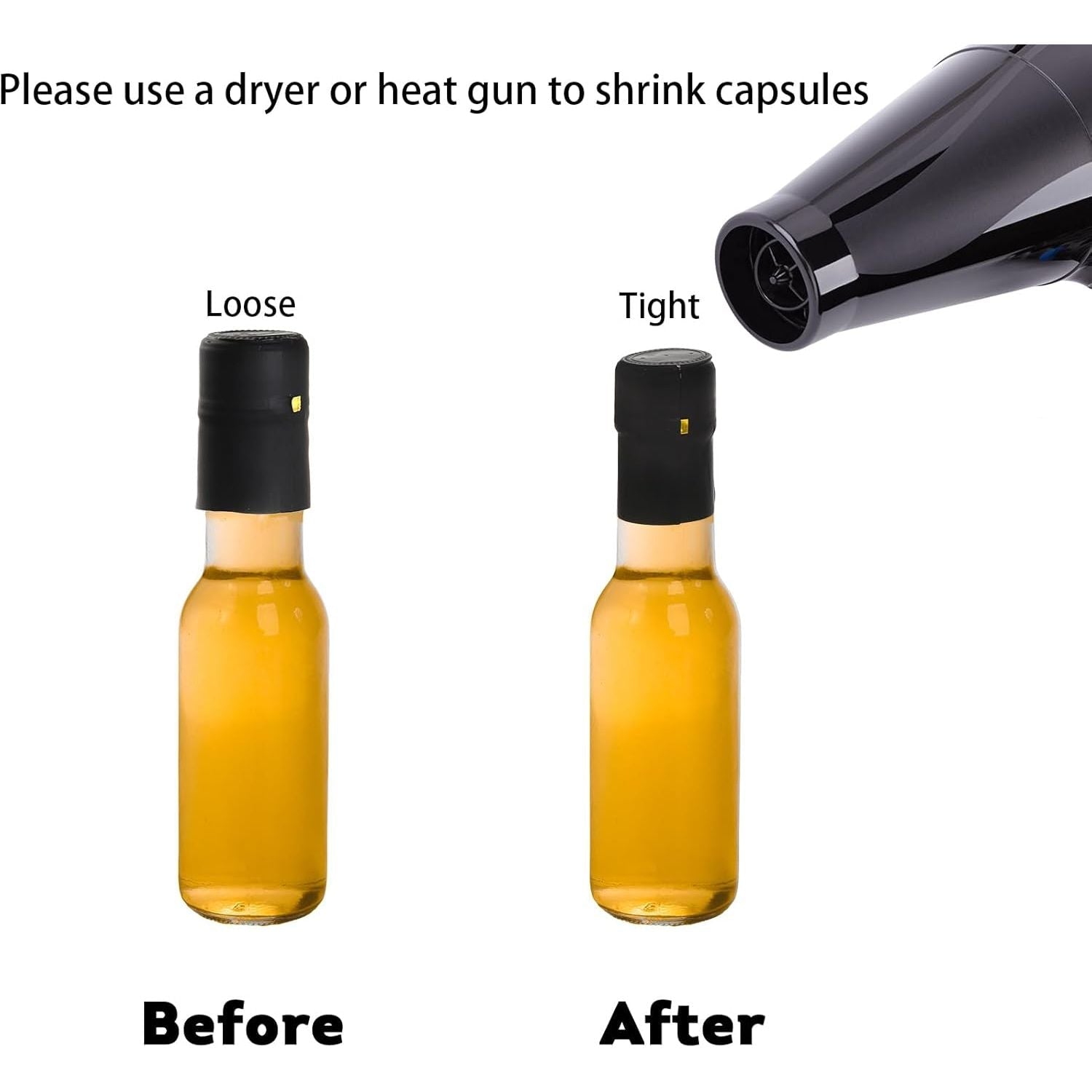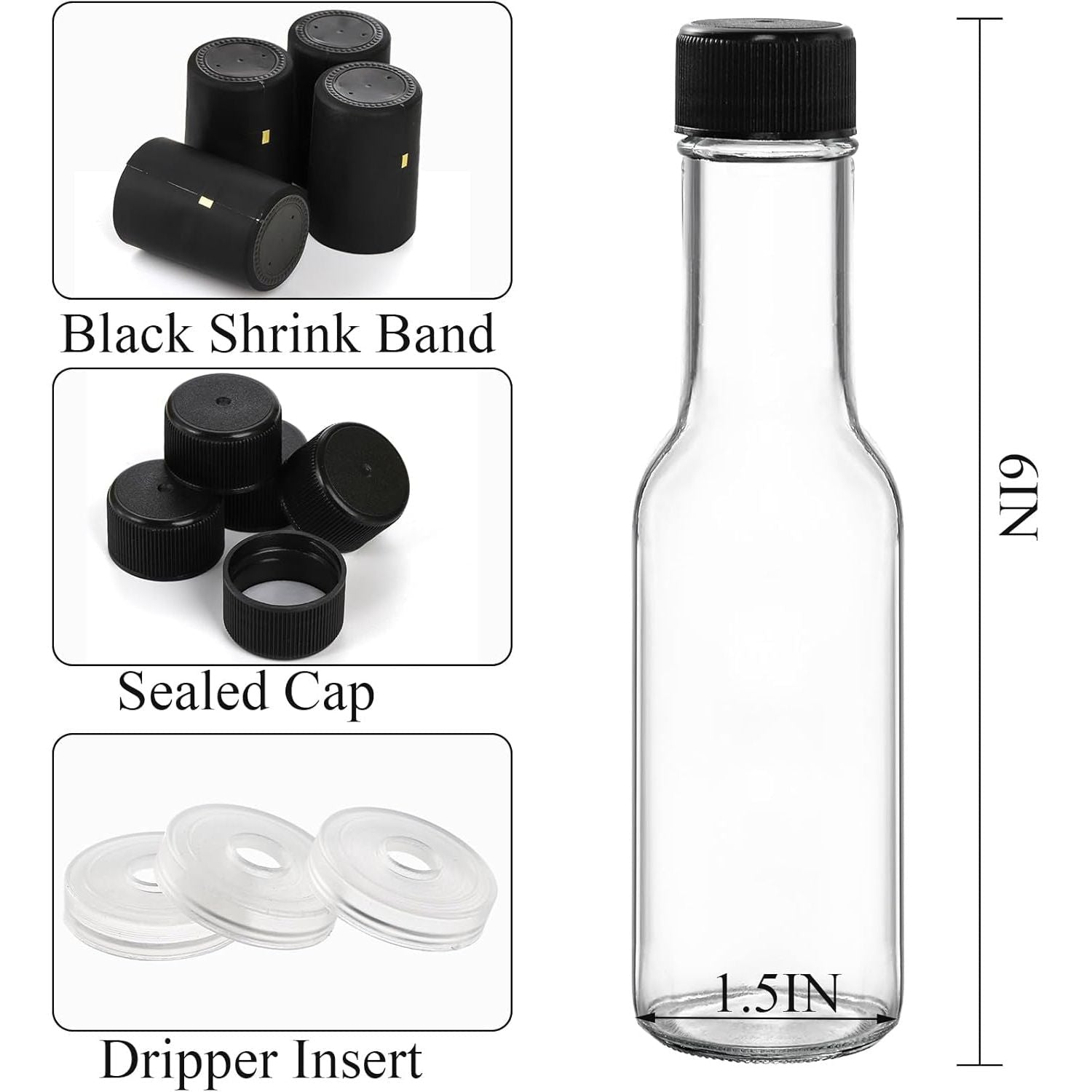 - Include 36 pack small glass bottle, 36 airtight black screw caps, 36 snap on dripper insert and 36 shrink capsule that designed with gold tear tab to help open them easily once they've been sealed to the bottle.