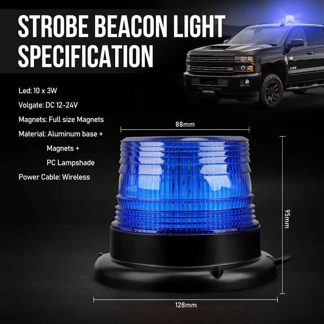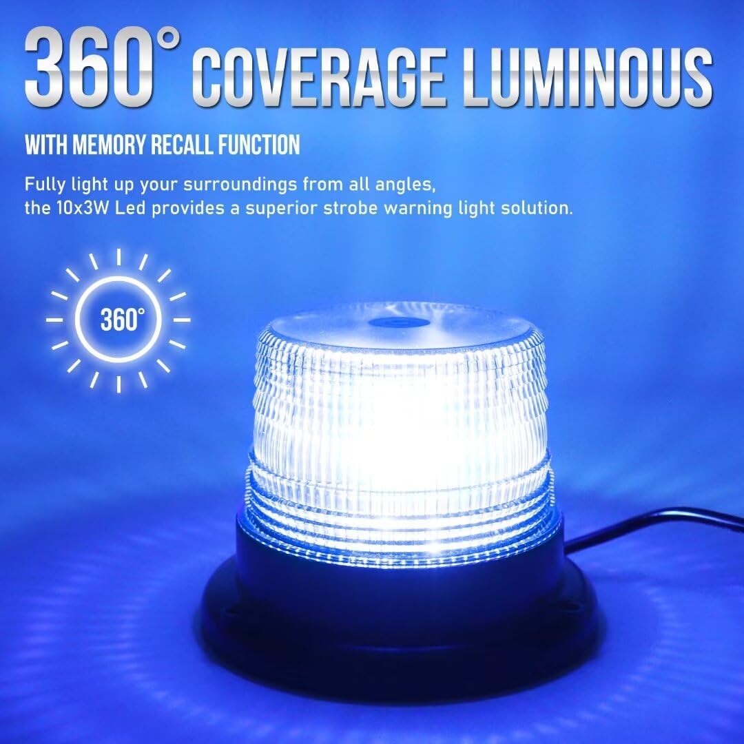 OPP ULITE Blue Led Strobe Light Magnetic Base 30W 7 Flashing Mode DC 12V-24V Emergency Beacon Roof Top Strobe Flashing Lights for Vehicle Forklift Truck Tractor Golf Carts UTV Car Bus