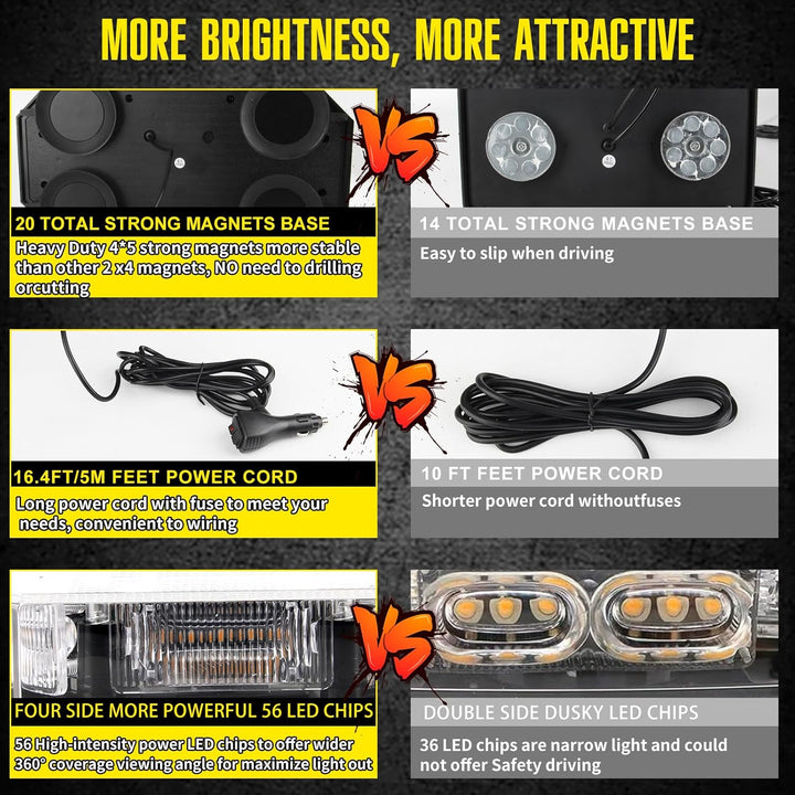 • SUPER VISIBILITY: 16Inch Amber LED roof top strobe light bar with upgraded 56 high intensity LEDs, 360° coverage viewing angle for maximize light out,brighter and more effective than standard Led Strobe Lights,creates high visibility during the day or at night.