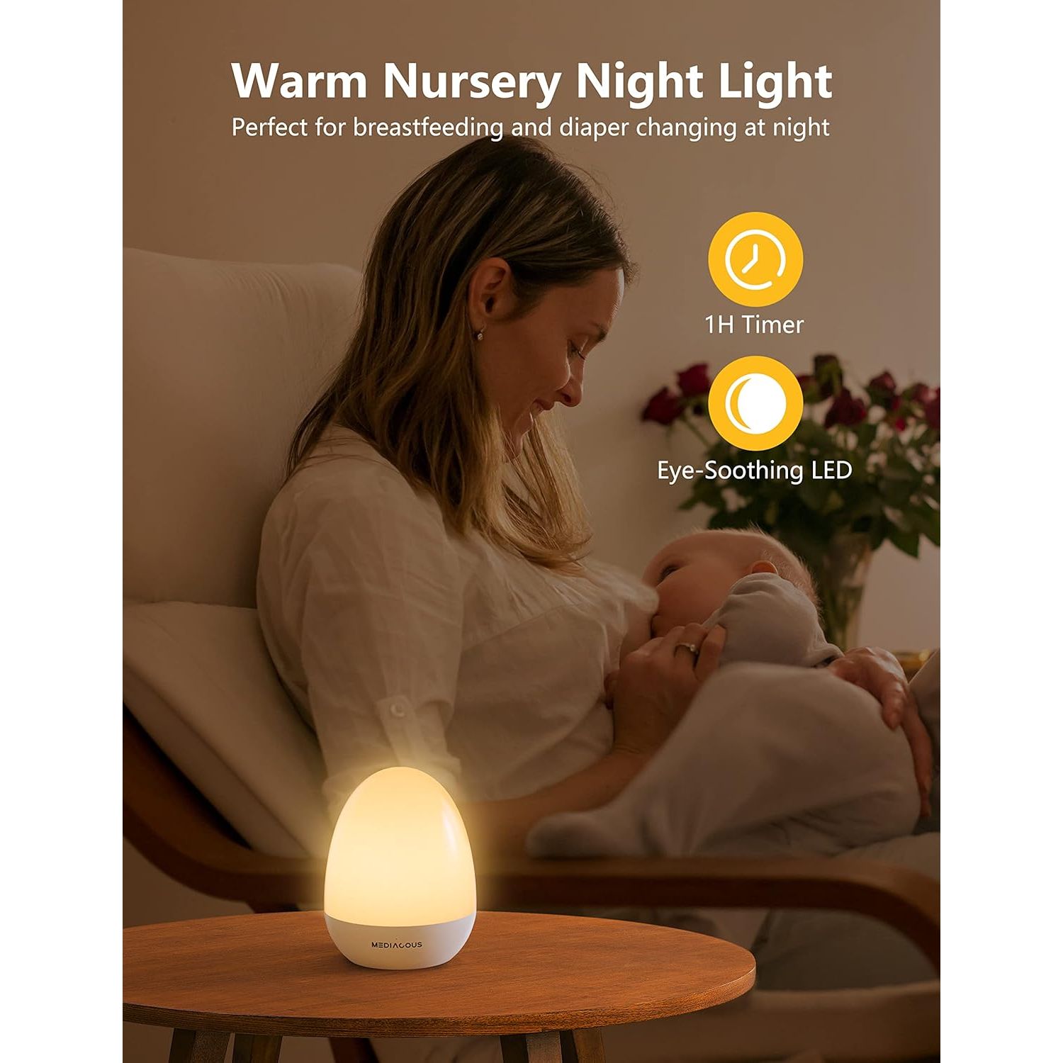 • Easy Touch control: Long press the top for stepless dimming; Tap the logo twice to set the 1-hour timer; Long press the logo for 0.5 seconds to switch color temperature between white and warm for breastfeeding.