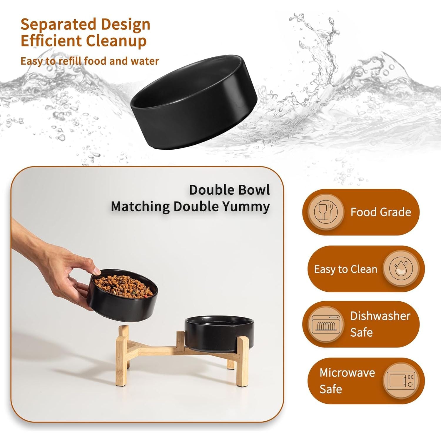 - Versatile and Easy Cleanup: Perfect for dry food, wet food, water, fresh food and snack. The detachable design makes it easy to carry, clean and store. And the double ceramic dog bowls are dishwasher safe and microwave safe. Regarding the maintenance of the bamboo stand, just wipe it with a dry rag.