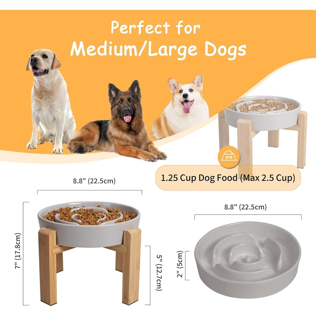 Elevated Slow Feeder Dog Bowl - Raised Ceramic Dog Bowl with Anti-Slip Stand - Puzzle Maze Dog Food Bowl for Fast Eaters - Heavy Big Dog Dish - Designed for Medium and Large Dogs - Grey - 8.8 inch