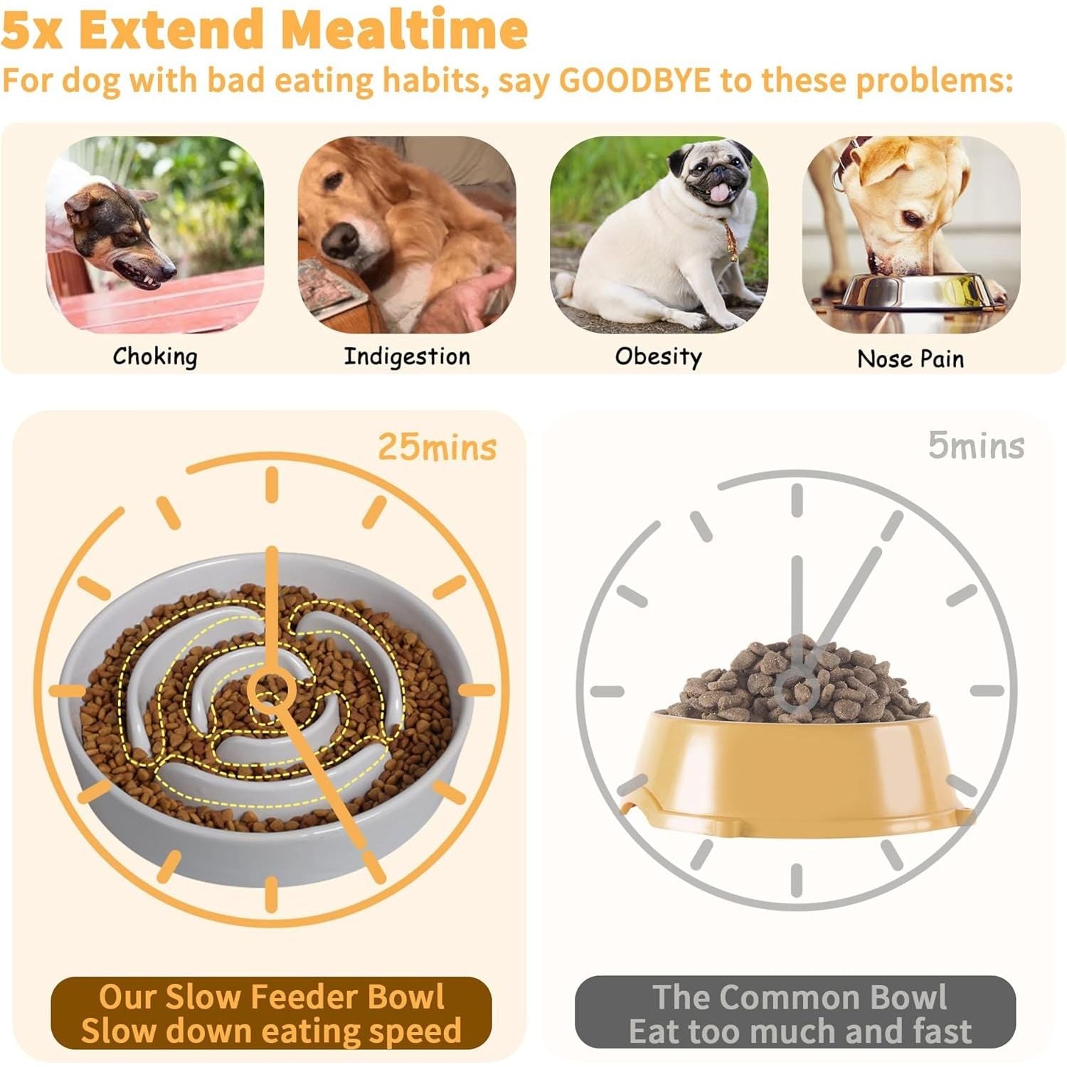 • Prolong The Mealtime to 5 X - Help to reduce the chances of dog gulping, choking, vomiting, bloating and getting obesity. The slow eating dog bowl encourages paced eating while satisfies dog’s natural foraging instinct, healthier for dogs.