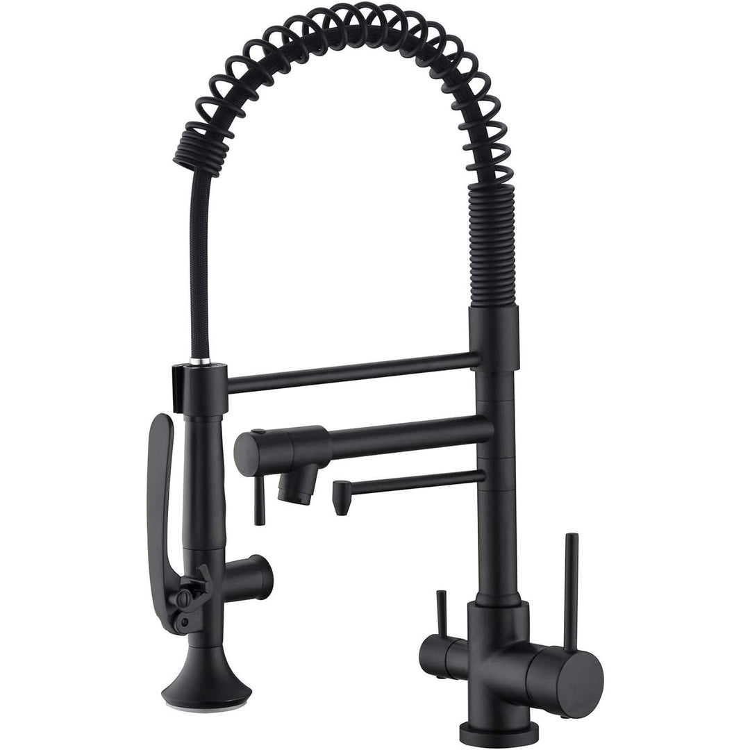 - Handsfree Design: Handsfree design allows you to utilize one hand rinsing while when you wash. 3 modes of the kitchen faucet can work together. One handle for controlling the black kitchen faucet with pull down sprayer and pot filler, another handle for controlling the water filter purifier faucet.