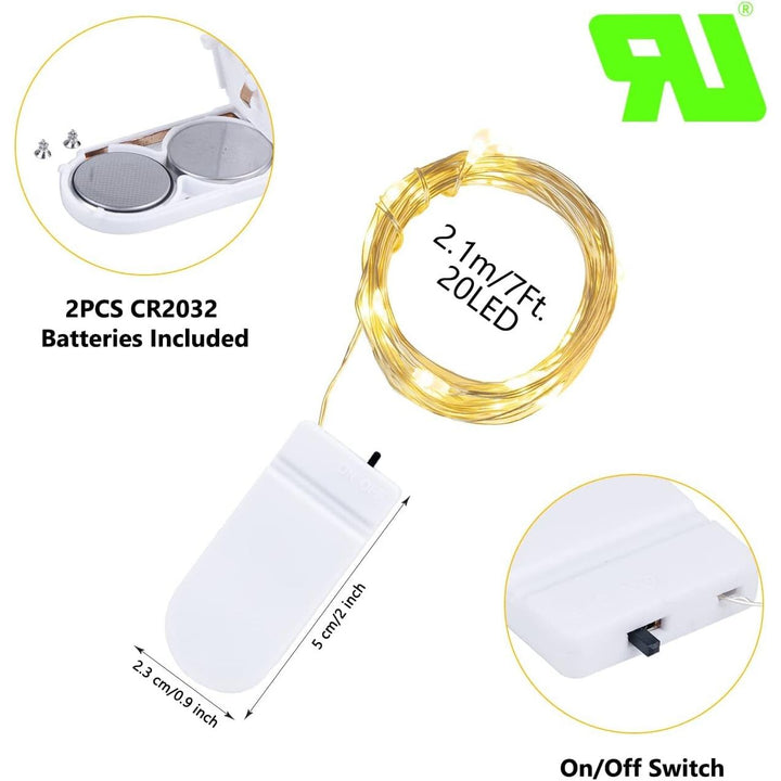 - Upgraded 12 Pack Silver Version: 12 Pack 20 LED fairy lights are made of high-quality 7 feet long flexible silver wire. Use 0.66 ft cable between first LEDs and battery box, 4 inches distance between LED Moon Lights. 2 x CR2032 batteries per light and a screwdriver included, 48-hour battery life ensure long-lasting use.