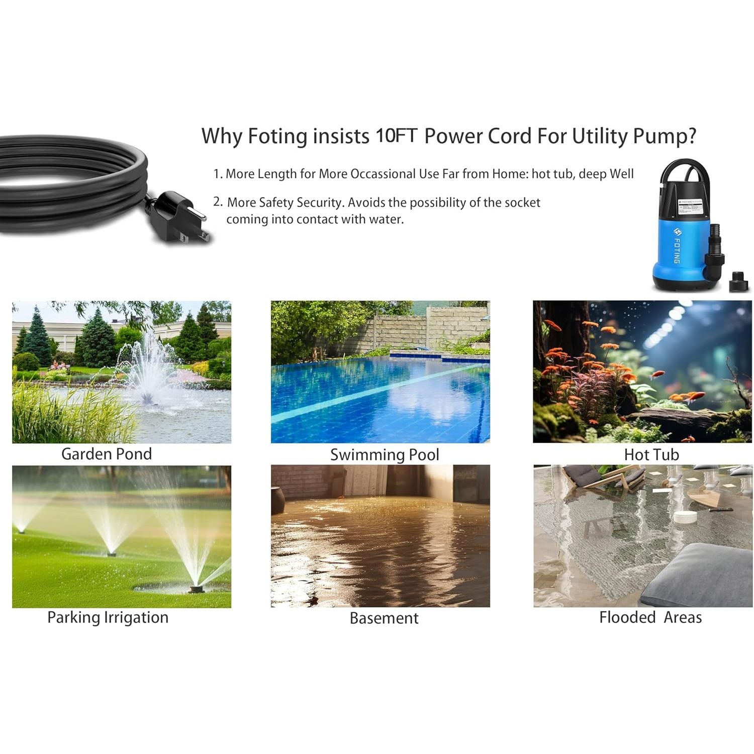 - 【Wide Application】Sump pump can be operated easily by plugging into the power supply. Variable for clean or dirty water from flushing hot tub, tankless water heater, basements, pits, rain barrels or other flooded areas. Also perfect for irrigation, garden watering, car washing and other home requirement.