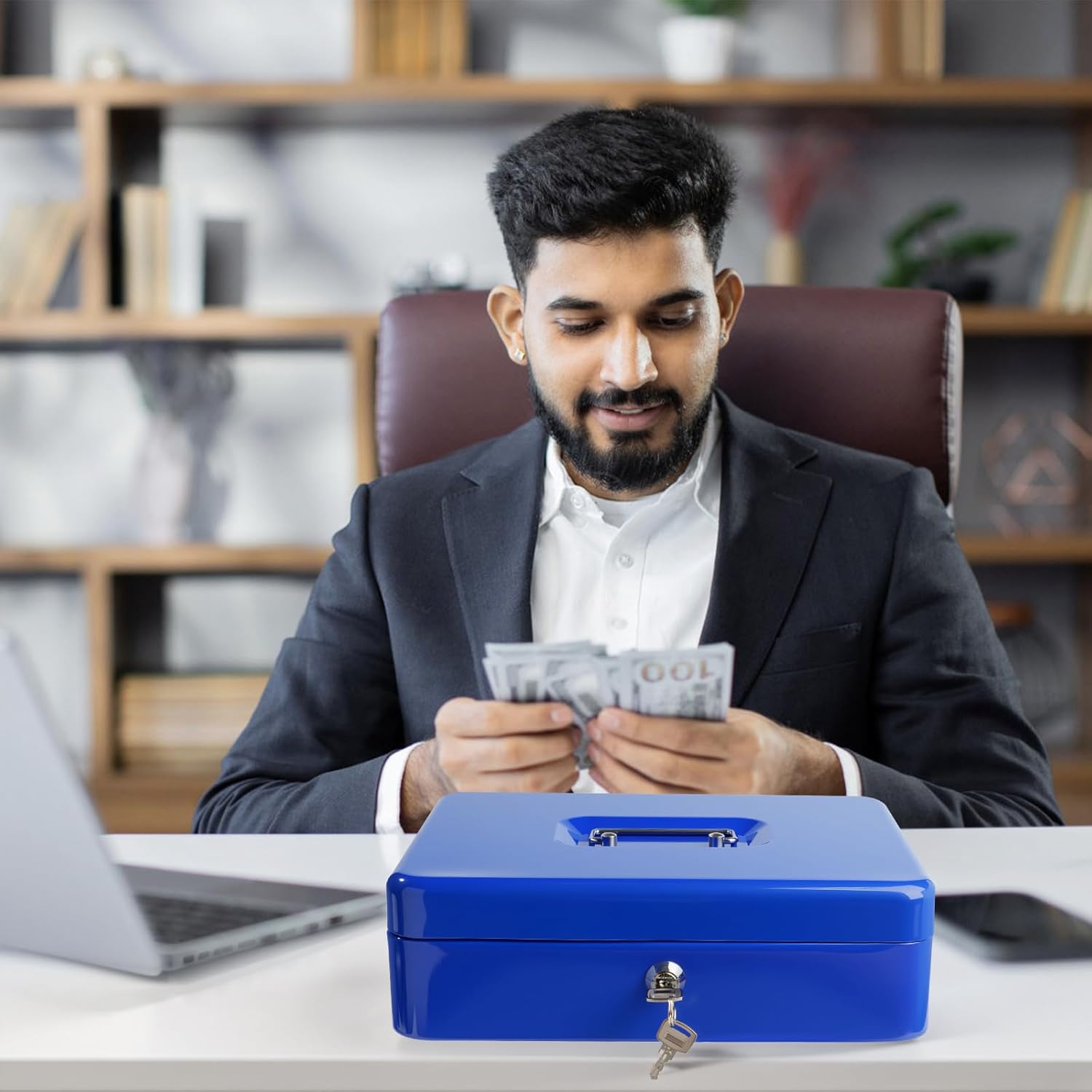 - VERSATILE CASH LOCK BOX: Measuring 11.8" x 9.4" x 3.54", our metal cash box with key is ideal for daily cash organization, yard sales, garage sales, craft shows, or use as a money saving box, change box, cash drawer, cash register for small businesses