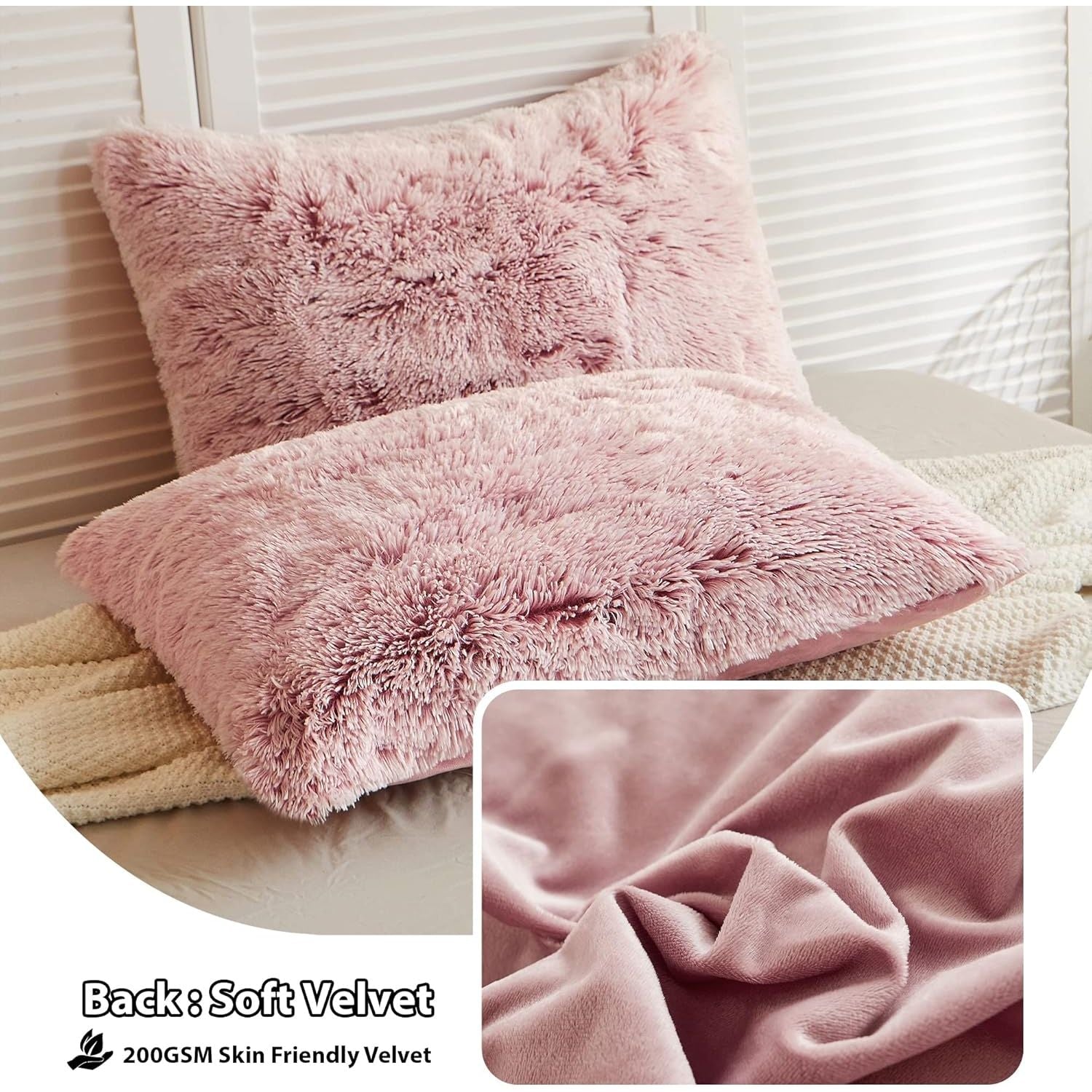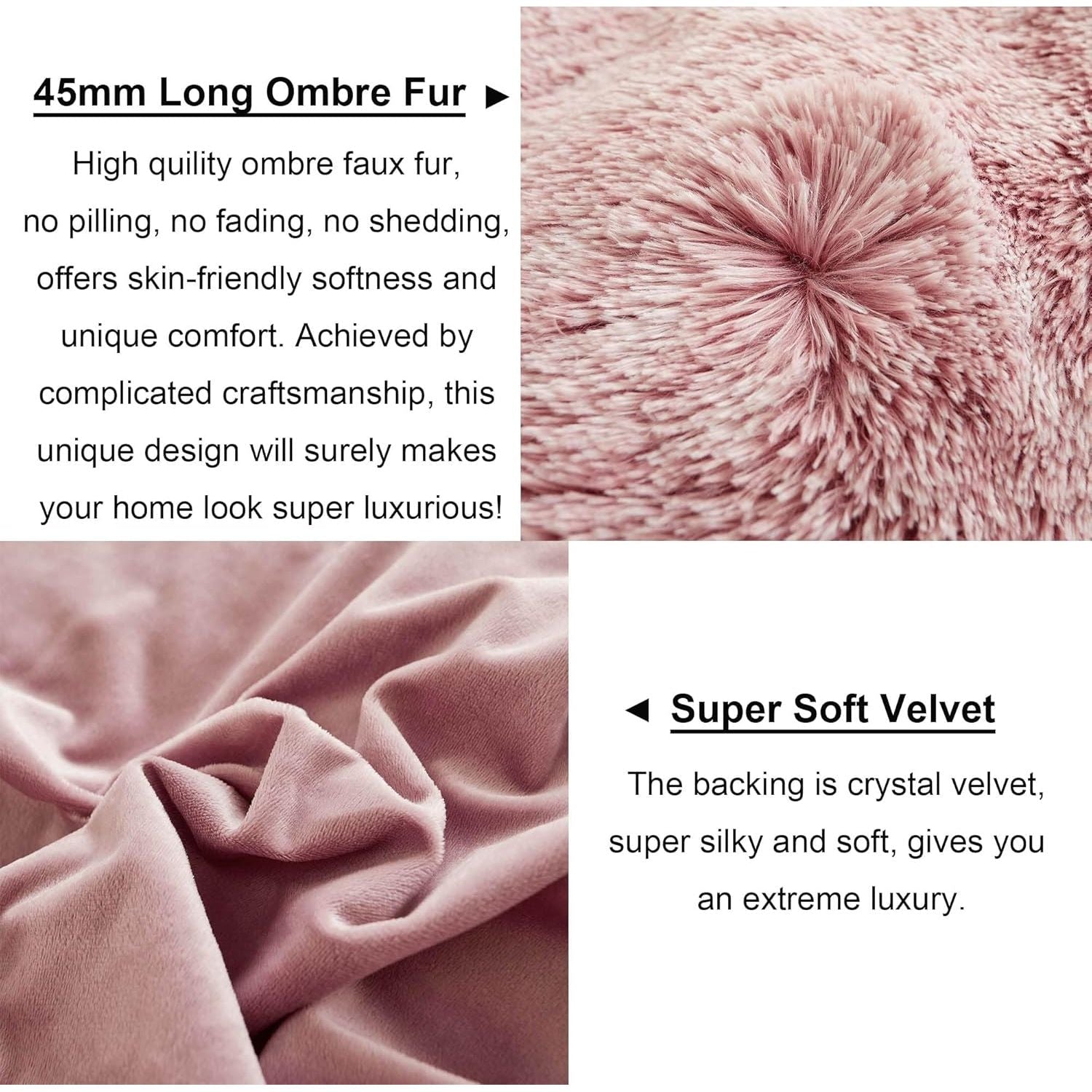- Material :The front of fuzzy pillow case are made of 45mm high pile microfiber long shaggy fleece and the back are ultra soft crystal velvet fiber. Anti-fading,anti-wrinkle,anti-pilling and create a luxury feeling.