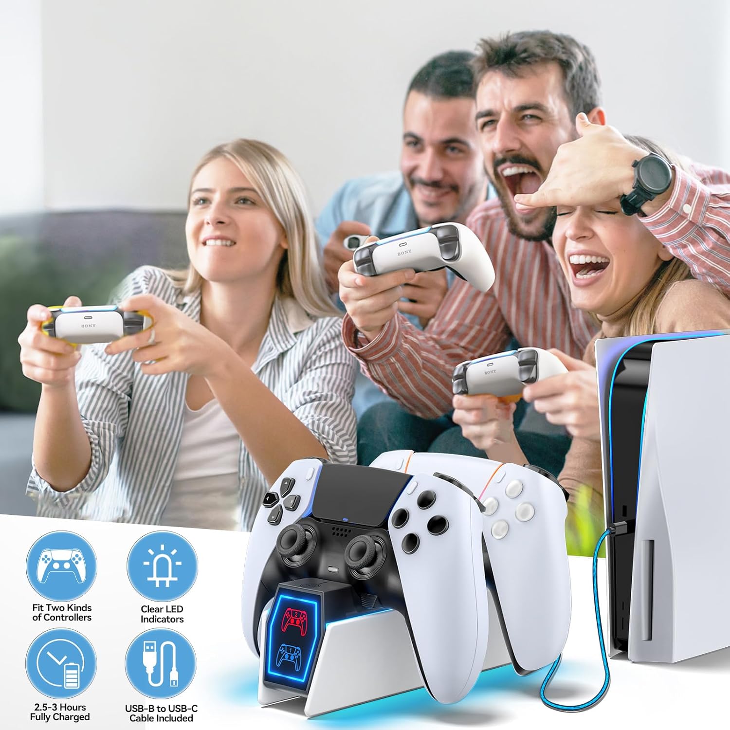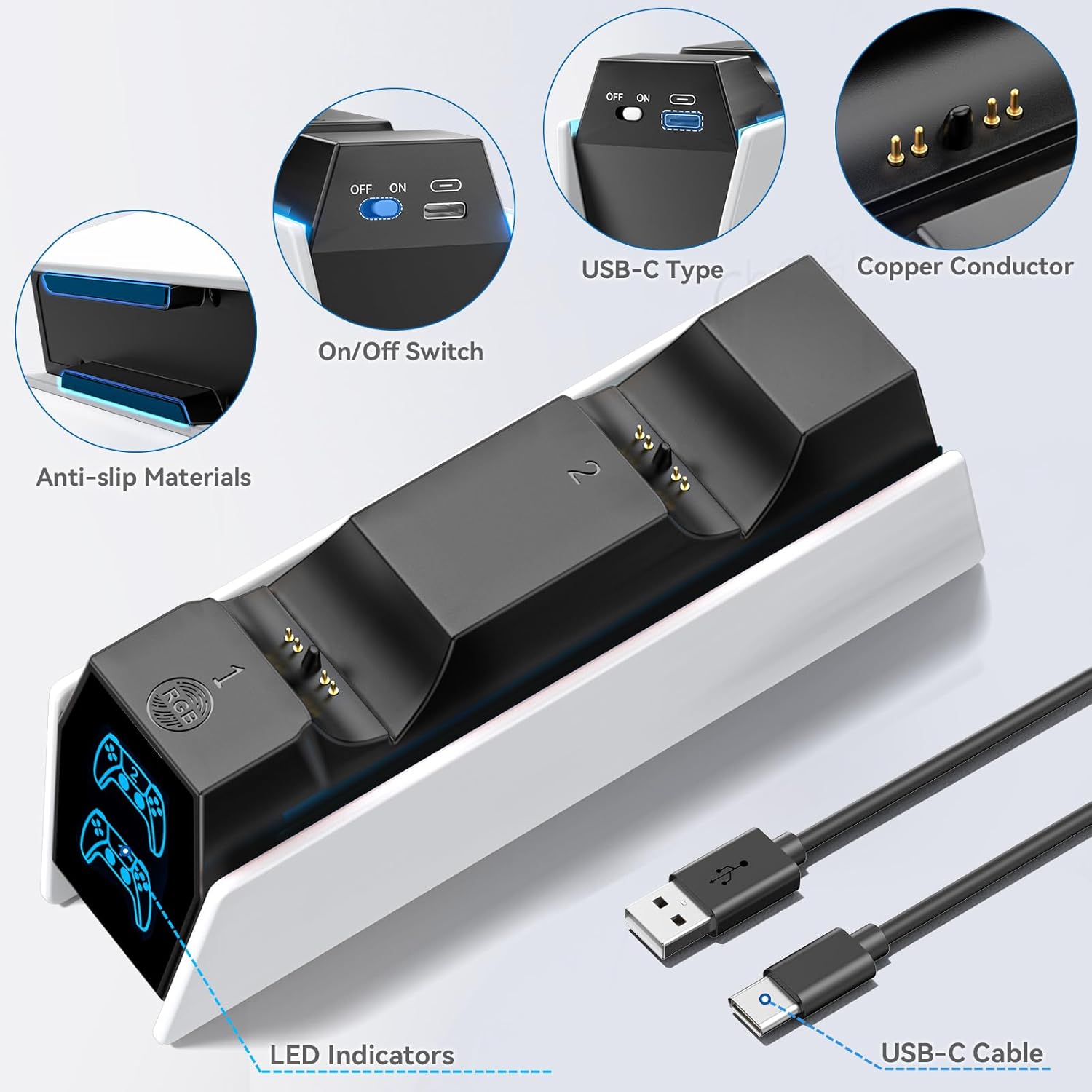 - 🎮【Enjoy Your Game】Compact PS5 controller charger dock is designed with advanced protection and practical features to bring a incredible experience to you. The PS5 controller charger station ensures a stable and secure charging experience, allowing you to focus on your gaming adventures without any worries.