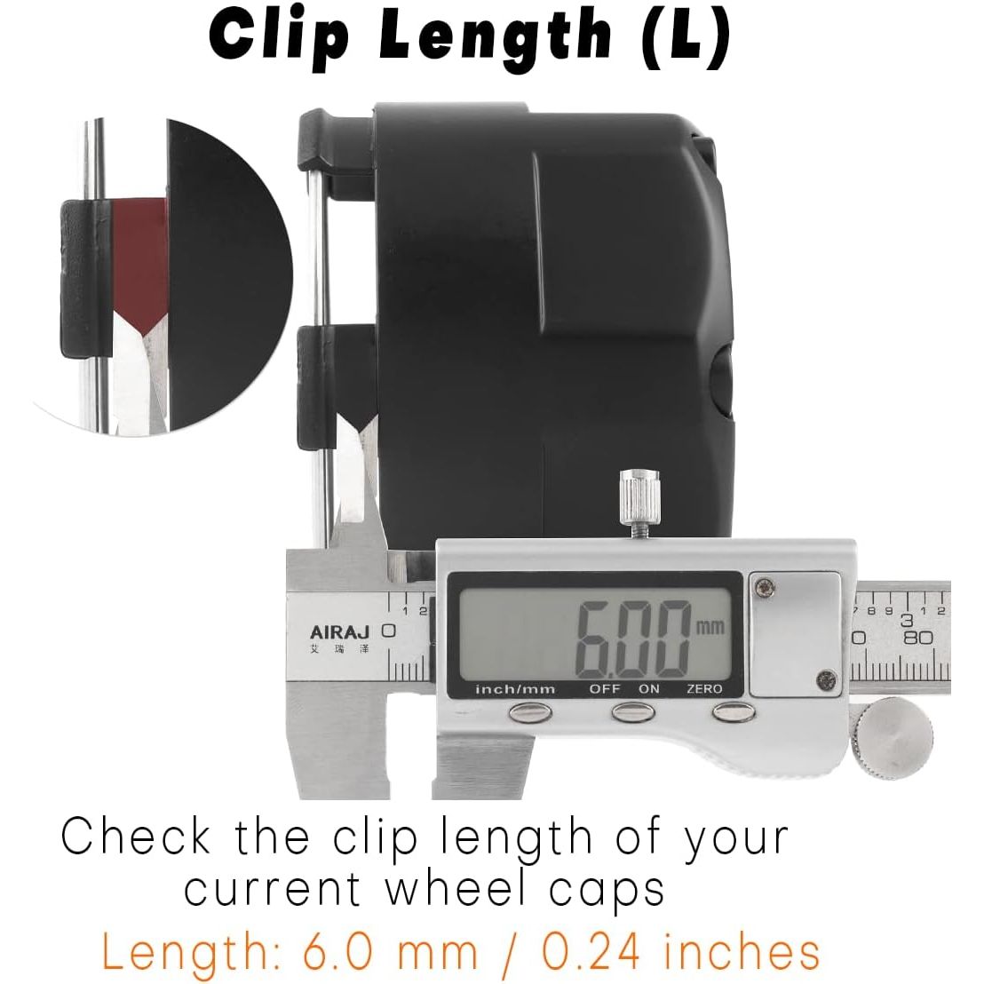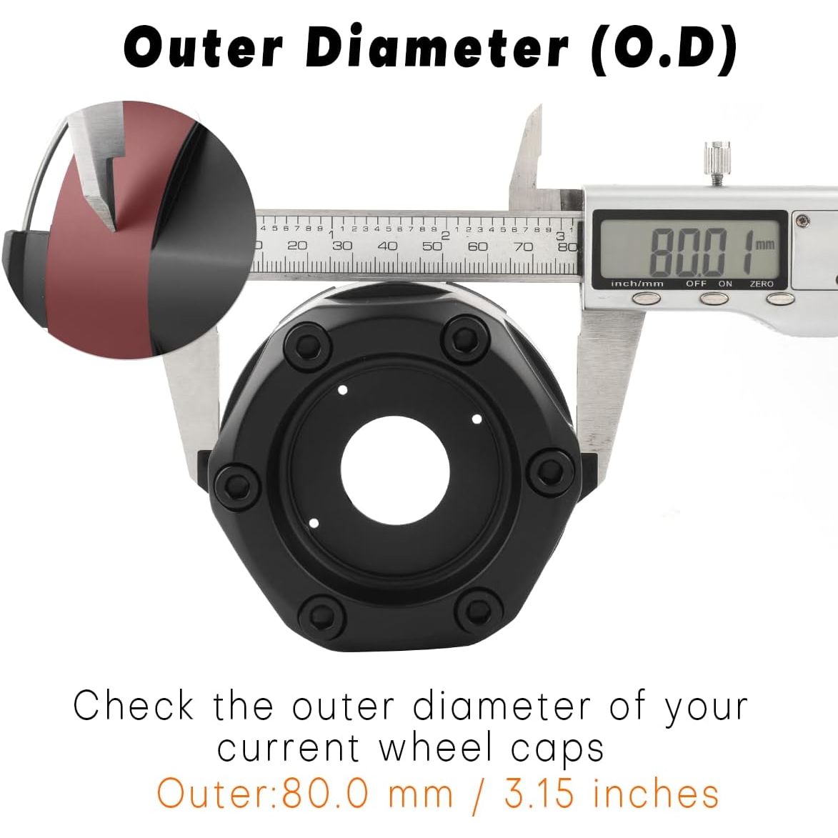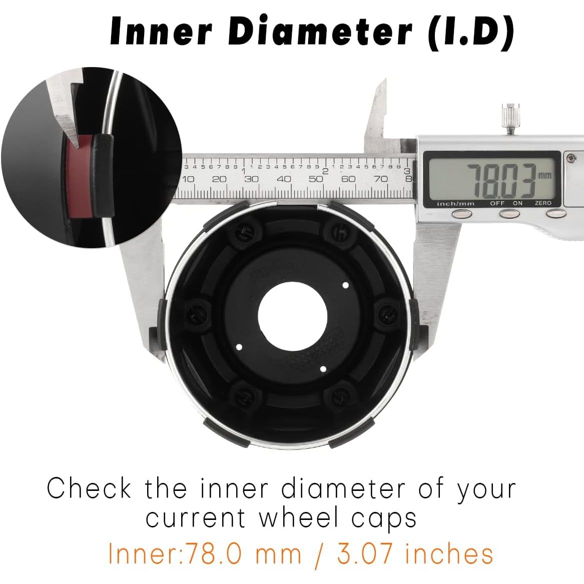 - Size: Outer Diameter: 80mm≈3.15inch, Inner Diameter: 78mm≈3.07inch, Clip Length: 6mm≈0.24inch, Total Height: 60mm≈2.36inch. Please use a digital caliper to check your original cap dimensions if you are not sure. If you are not sure about the size, please feel free to contact us.