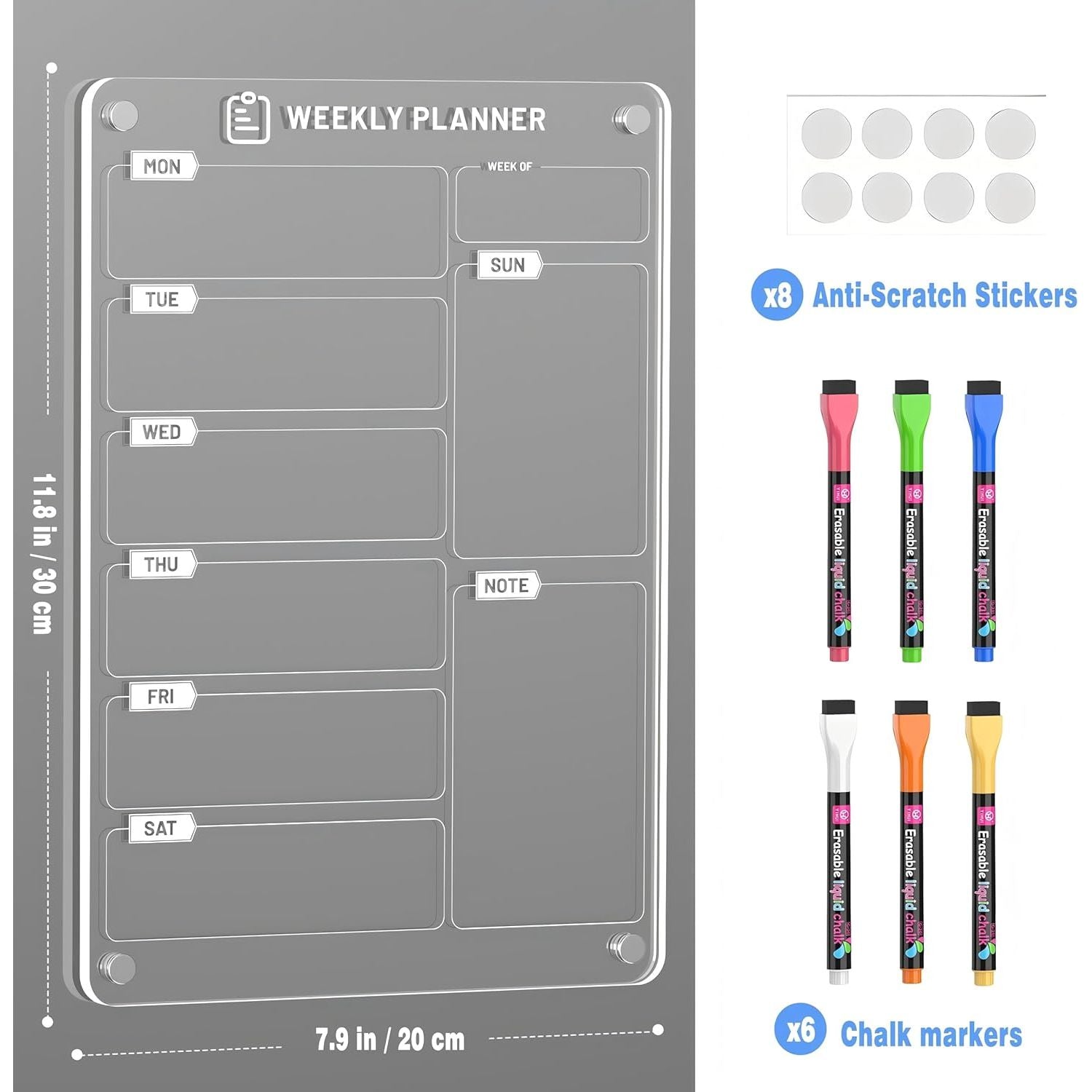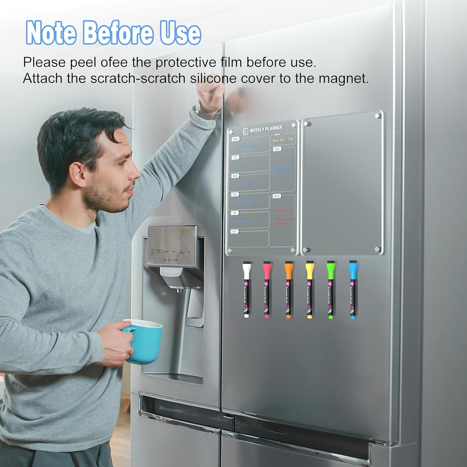 - Package Contents & Warm Tips: Each package contains 1 fridge planner and 1 clear board, 6 chalk markers, 8 magnets, and 8 scratch-resistant stickers. Not suitable for refrigerators with a white background, curved refrigerators, non-magnetic stainless steel (such as 304, 316 stainless steel).