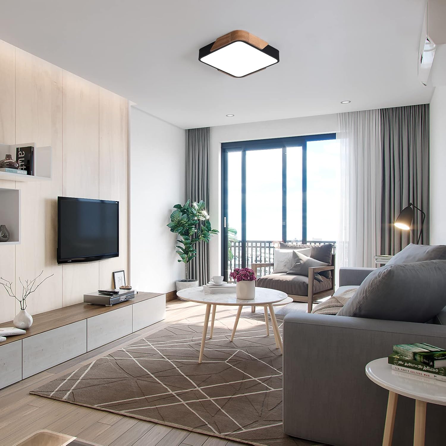 - Led ceiling light size and material:Power: 24 W, Voltage: 110 V, Color temperature: cool white 6500 K, no dimming. Size: 11.8*11.8*1.97 in (30*30*5 cm) Ultra thin thickness design. Material: iron and wood, clear wood grain, with a certain luster