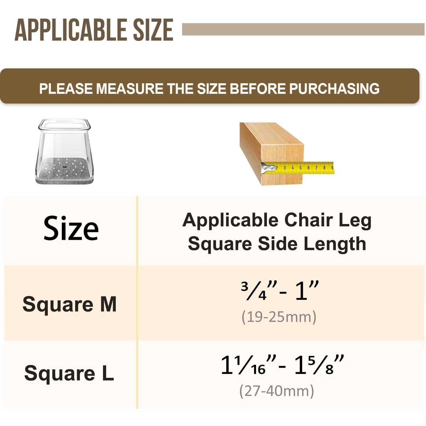 • Applicable size:Suitable for chair foot Square side length 3/4" ~ 1" (19mm-25mm)