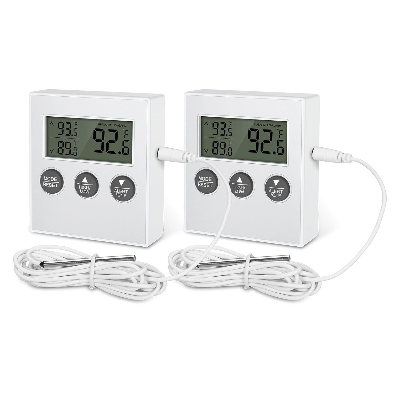 • MULTI-FUNCTION: The digital refrigerator thermometer displays probe temperature on the same screen, also including maximum and minimum display. The default high temperature alarm temperature is 40°C, and the low temperature alarm temperature is -40°C. You can set the maximum and minimum alarm temperature according to the actual situation