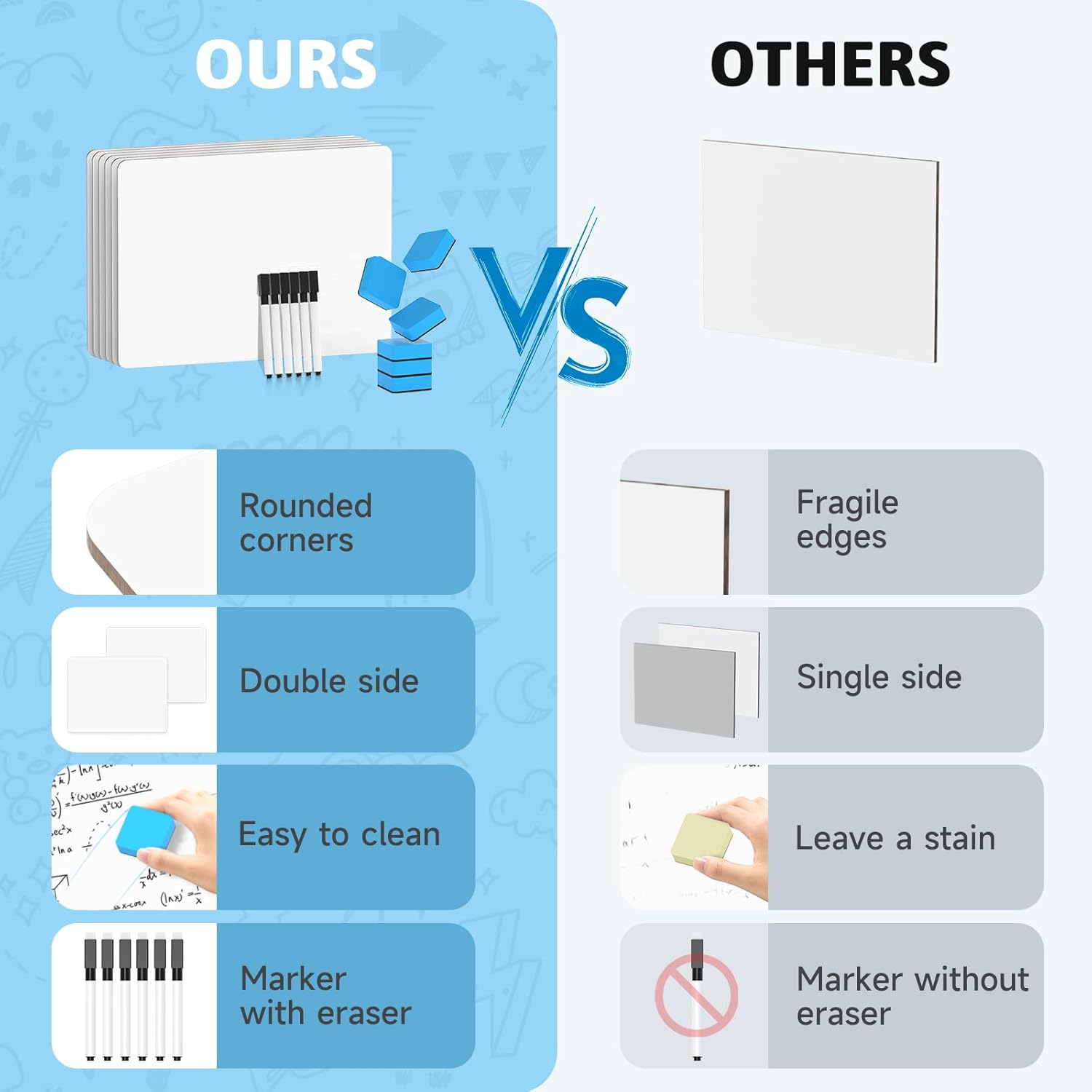 - 【Double Sided Dry Erase Board】Whether it's simple math problems or ABCs and doodling, the Dry Erase Lapboard is perfect for a variety of activities. These double-sided whiteboards offer more writing space than ever before. Just flip the whiteboard over and get on with your creation.