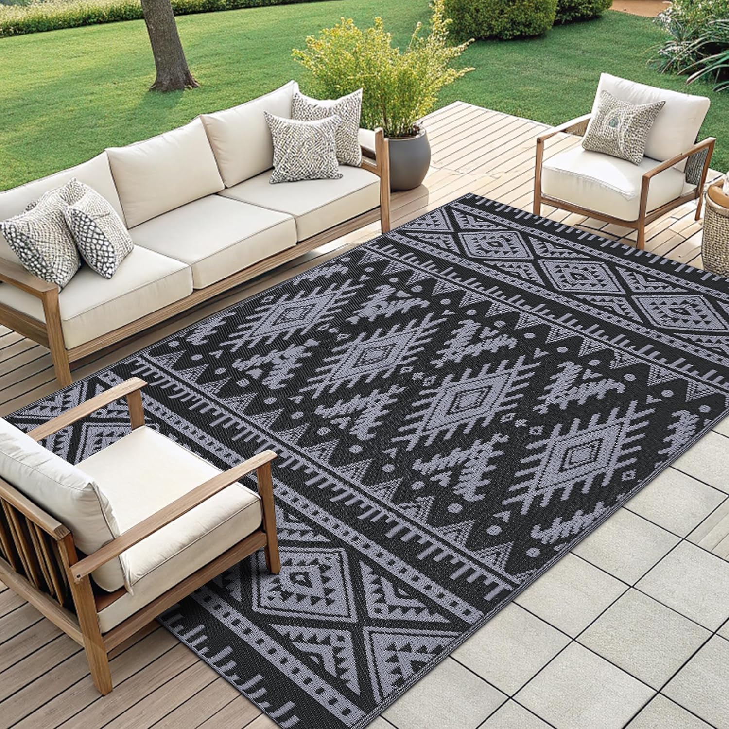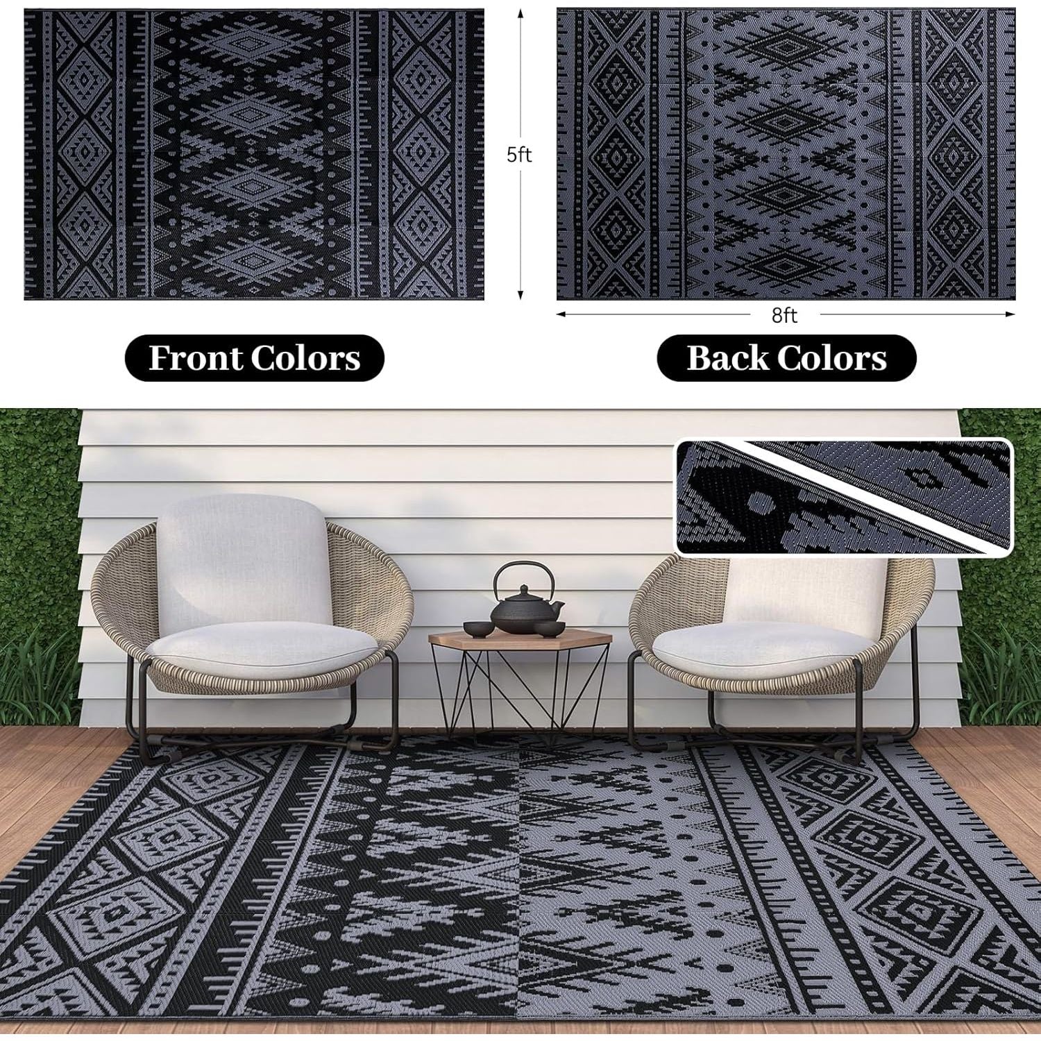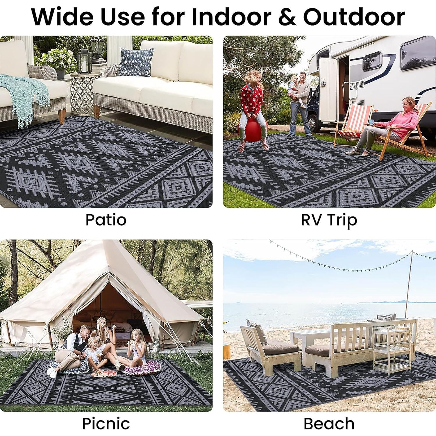 - REVERSIBLE & PORTABLE: This outdoor patio rug boasts dual-sided patterns, providing versatile color options and extended durability. Complete with a handy carry bag, it's perfect for outdoor activities.