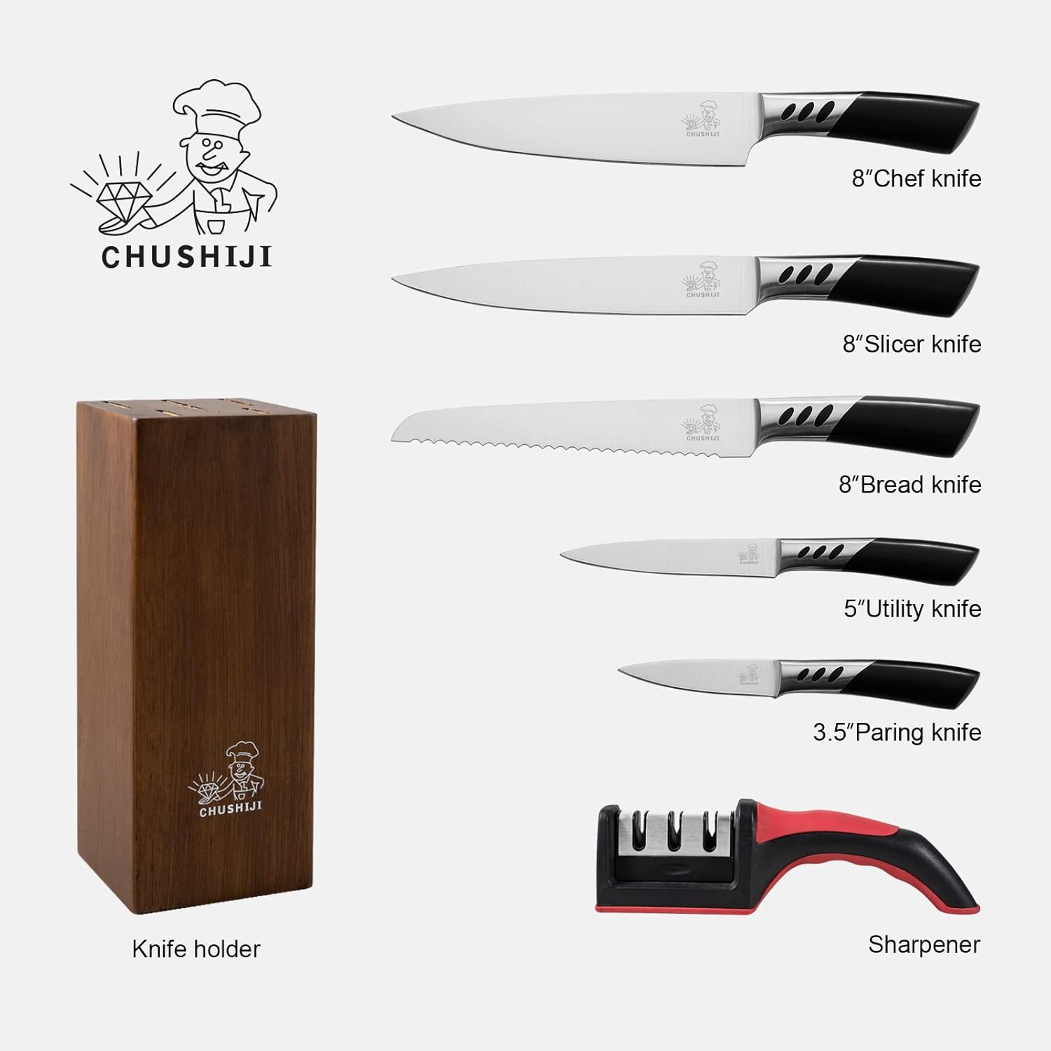 CHUSHIJI Knife Block Set 7 Pieces Cooking Knife Set,Premium Kitchen Knife Set with Block,Stainless Steel Kitchen Knife with Sharpener, Hardwood Brown Chef Knife Set - Just Closeouts Canada Inc.
