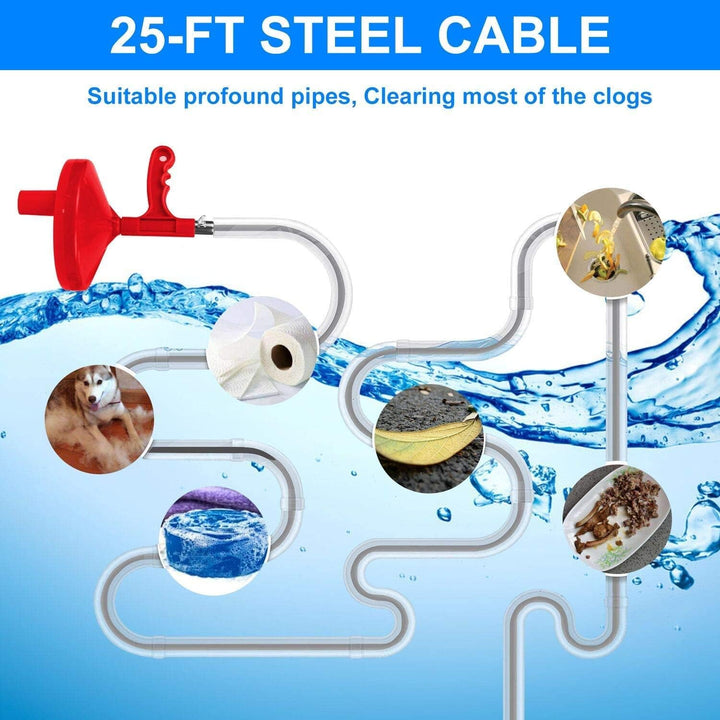 • [25-Ft of Heavy-Duty Steel Cable]: Flexible spring is free to extend to 25ft, can easily solve deep pipe blockage problems. It requires no chemicals and will never do harm to your drain pipe.