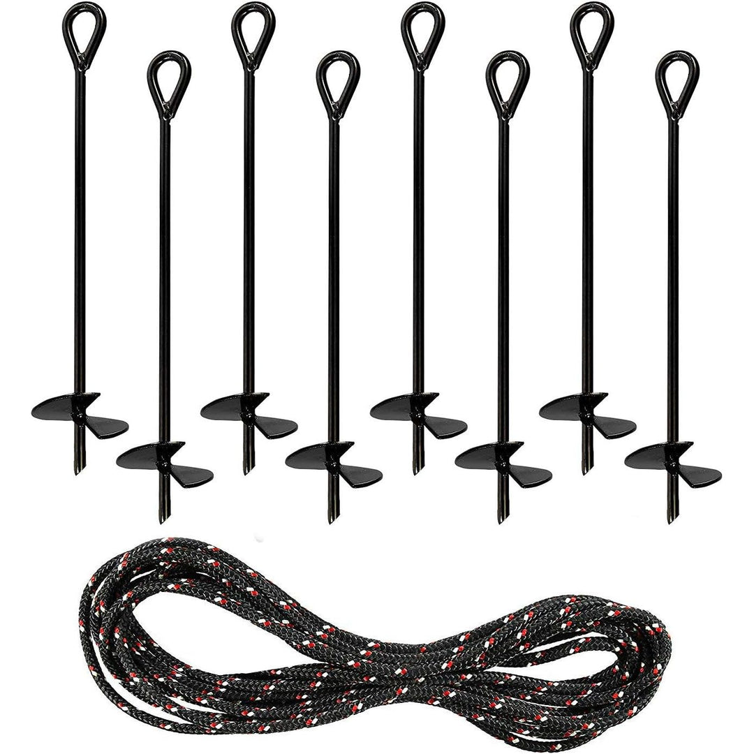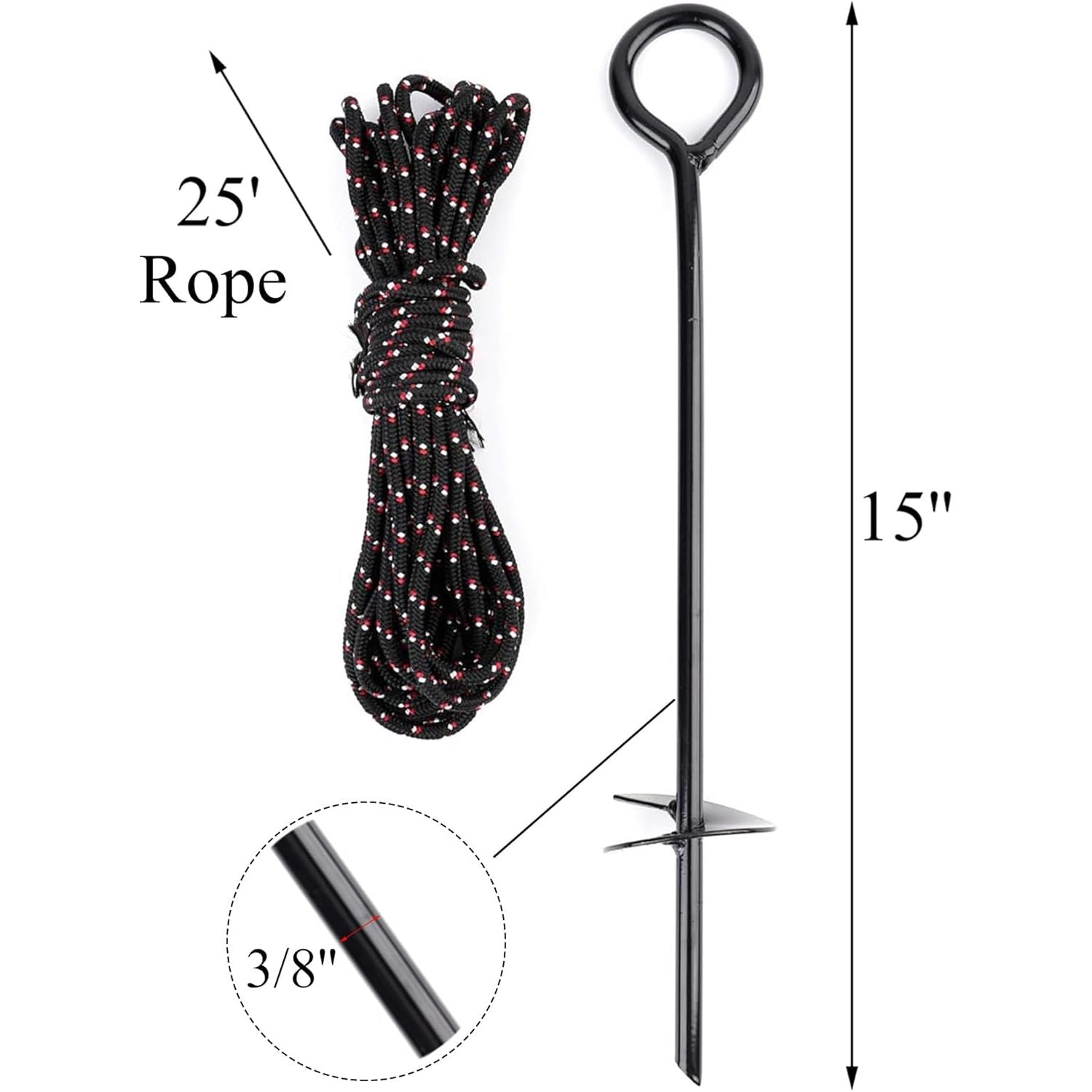 Packaged included: 8 pieces 15 inch length, 3/8 inch thick black ground anchor and 25 feet of rope.